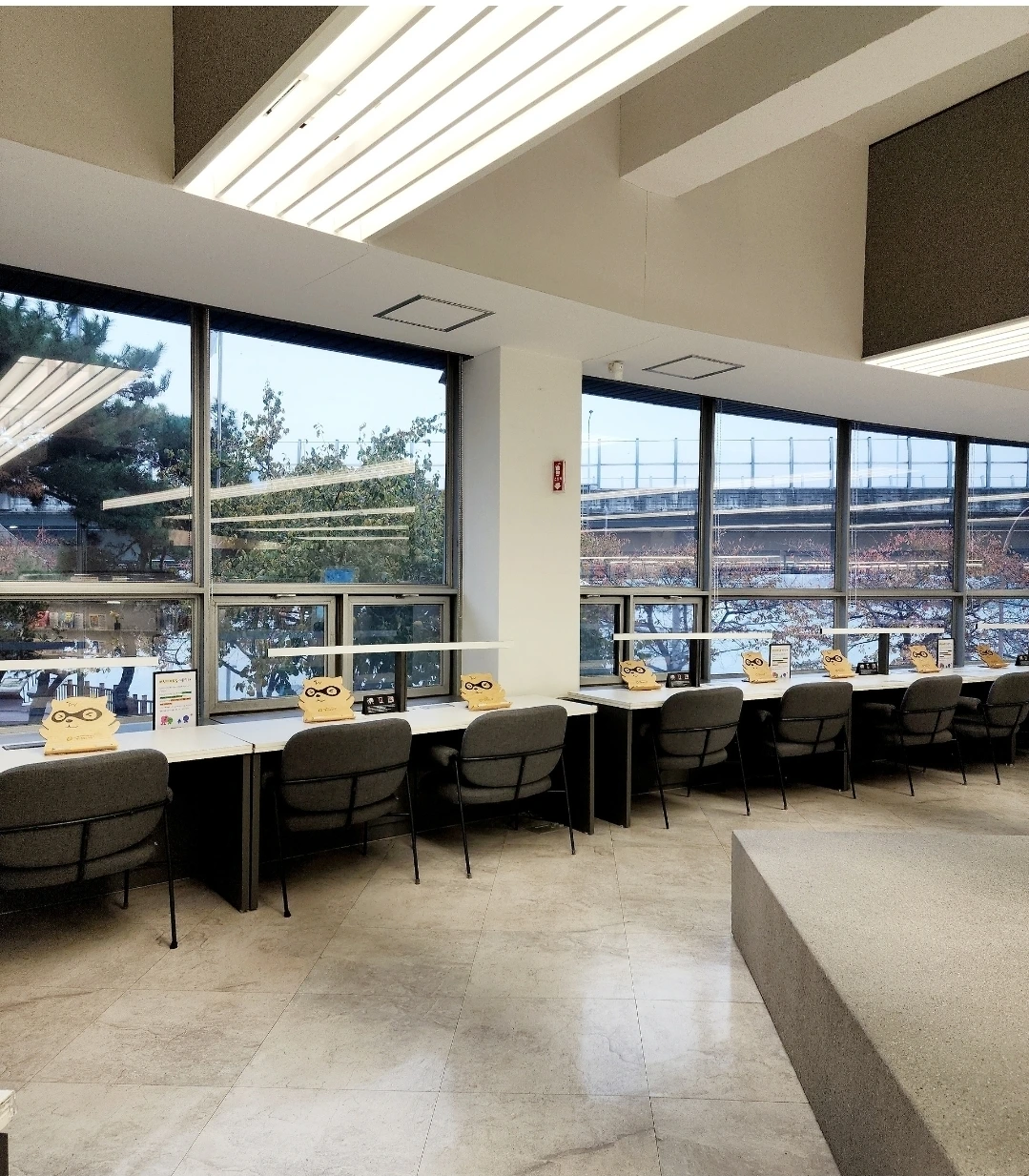 한강을 바라볼 수 있는 창가에도 책상이 배치되어 있다. 푹신한 의자에 앉으면 창밖의 푸른 나무와 서울을 가로지르는 멋진 한강을 보며 책을 읽을 수 있다.