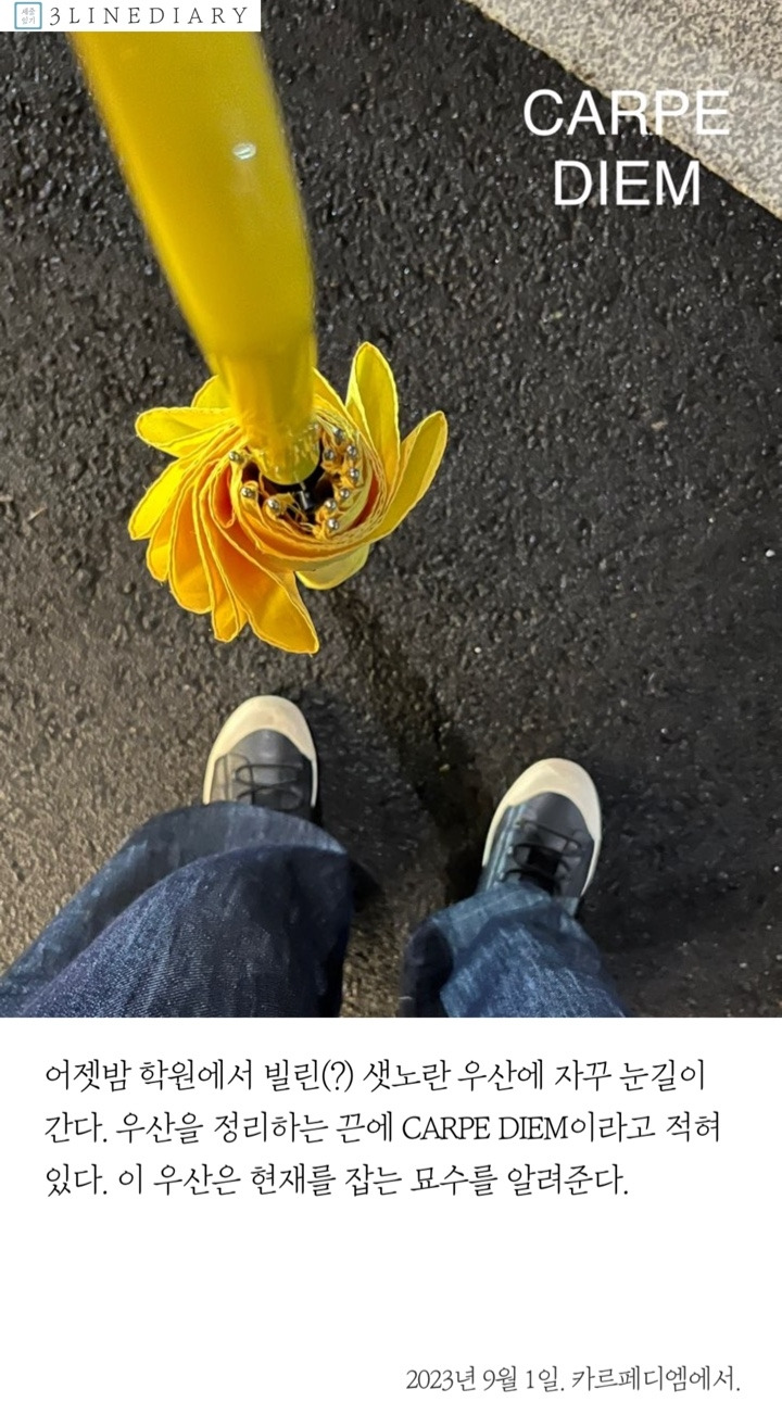 샛노란 우산 속 'CARPEDIEM'이라는 글귀를 발견한 순간 생각했다. 역시 한 번씩은 우산을 빠뜨릴 필요도 있는 거야. 그래야 이렇게 예쁜 우산도 만나고 생각지 못한 행운처럼 현재를 붙잡고 살라는 귀한 메시지도 얻기도 하니까. 이래서 인생은 재미있는 거지! 그러나 또다시 비가 내리기 시작하니 한숨부터 나오는 건... 어쩔 수 없네.