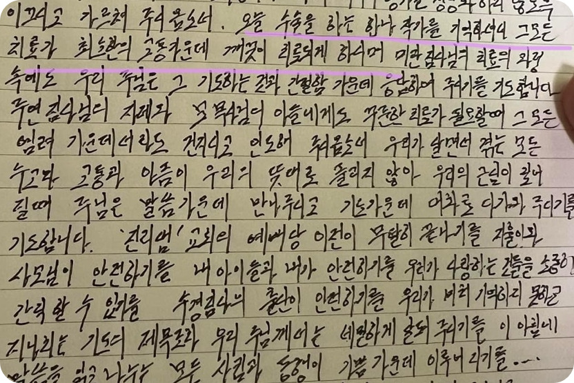 서울의 어느 종합기독교백화점 대표님은 아침마다 작성하는 기도 노트에 이름까지 올려 기도를 드린 후 공지하기도 했다. 수술 시각으로 정해진 3시가 되자 안동에 있는 어느 자매는 기도 제목을 올려 또 기도 요청을 공지한다.