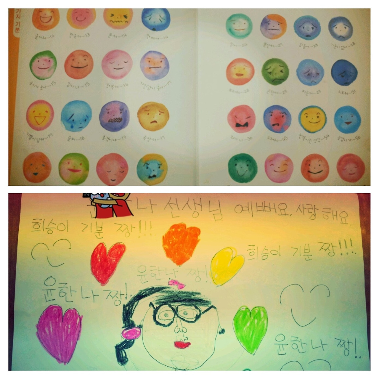 어린 친구들은 보통 무조건에 가깝게, 가르치는 선생님을 예쁘다고 한다. 물론 그렇다고 다 공주같이 그리지는 않지만, 그 당시 수업 시간에 입었던 반팔 티셔츠와 안경, 머리끈, 입술색까지 다채롭게 색칠한 사진에 행복이 살며시 올라온다.