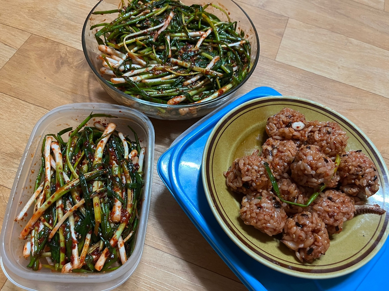 어머니 손끝으로 버무려지는 파김치는 예술 그 자체이다. 하나의 명화 같다. 노란 양동이에 갖가지 양념을 끼얹은 파가 돌아가며 춤을 춘다. 찬기에 나누어 담은 후 버리기 아까운 양념을 밥과 섞어 주먹밥을 만들면 꽤 근사한 간식이 된다.