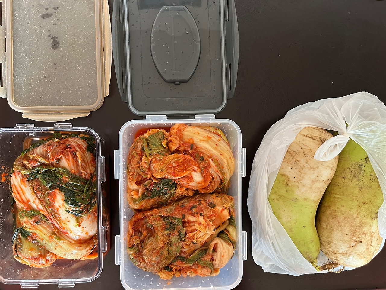 김치를 보내겠다는 기별을 받자마자 소액을 보냈다. 작은 마음의 표현이다. 이틀 전 새로 담은 김치와 전에 담아놓은 김치와 어머니가 농사지은 밭에서 뽑은 통통한 무 두 개.