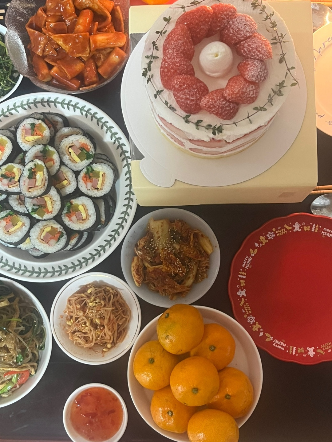 어머니는 미리 얘기한 대로, 알바를 마치고 김밥과 떡볶이를 사 오셨다. 집안 정리 안 한다고 언니에게 한 소리 들은 동생은 비밀리에 잡채랑 버섯 베이컨말이와 데친 파를 돌돌 말아 데코를 했다.