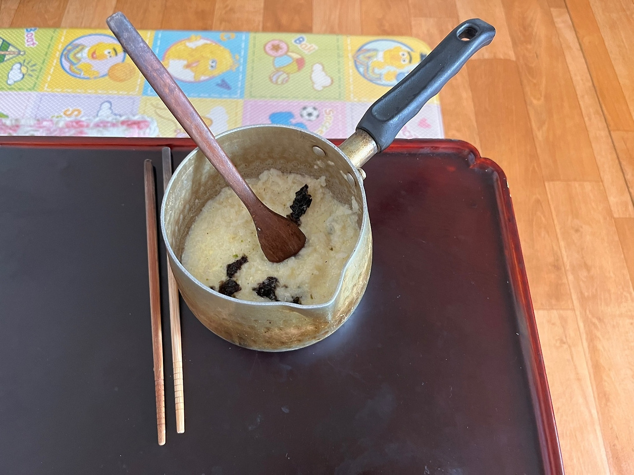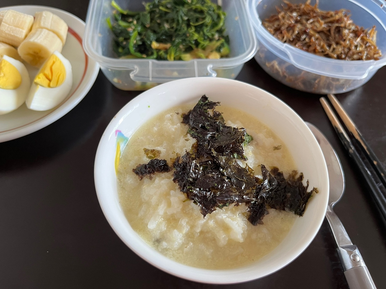어중간하게 남은 찬밥을 활용하는 어머니만의 비법. 계란죽을 만드는 것이다. 오늘 아침도 계란죽을 먹었다. 한입에 먹기 좋게 잘린 바나나와 삶은 계란은 덤이다.