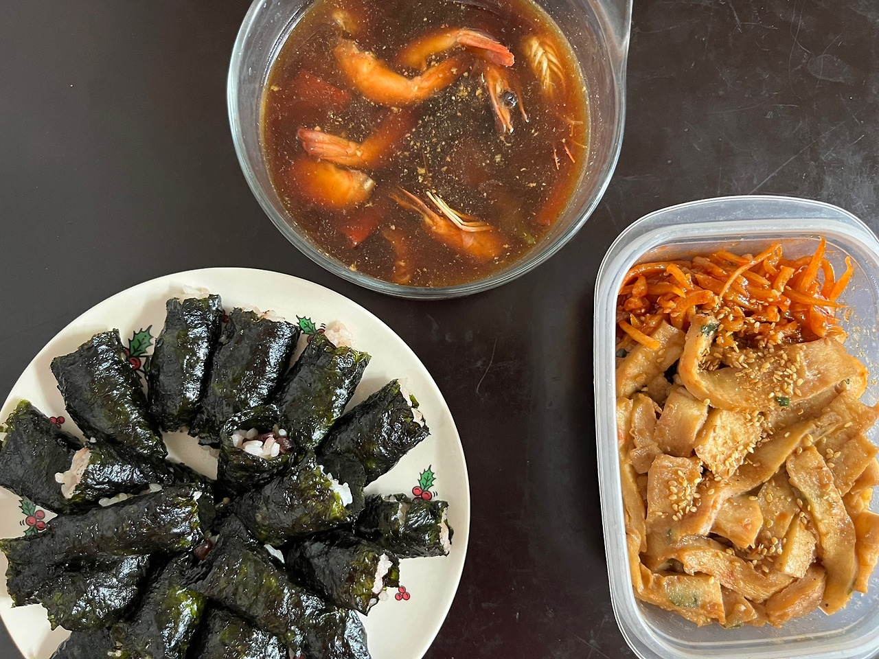 그녀는 어제 트럭에서 한 바구니에 만 원 하는 커다란 새우를 사서 달큼한 간장 베이스로 새우 조림을 만들었다. 동생이 오일장에서 사 온 어묵으로 따끈한 어묵 볶음과 마트에서 산 일미채 볶음이 한 곳에 담겨있다. 어중간하게 남은 밥은 일일이 조미김에 싸서 입에 넣기 좋게 담아두었다.