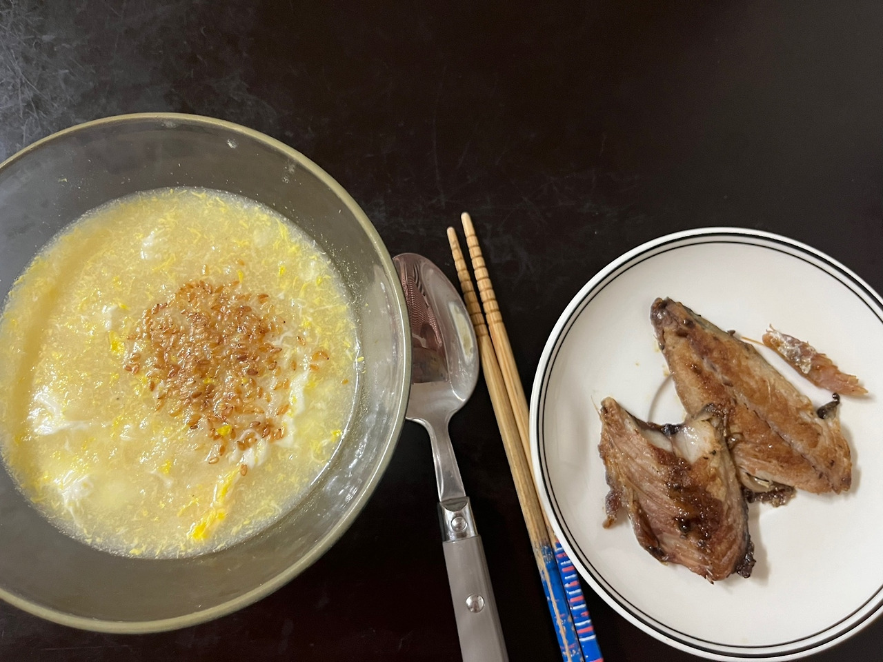갈색과 고동, 검정과 자주, 살구빛과 주황 등이 섞인 간장 새우 조림에 이어 어제 아침으로 차려준 계란 죽은 연노랑이 따뜻한 느낌을 준다. 한 곳에 기울어진 참깨가 귀엽다. 비려서 생선을 그리 즐기지 못하지만, 구워주신 생선 한 토막은 어머니의 애정이 듬뿍 담긴 보양식이다.