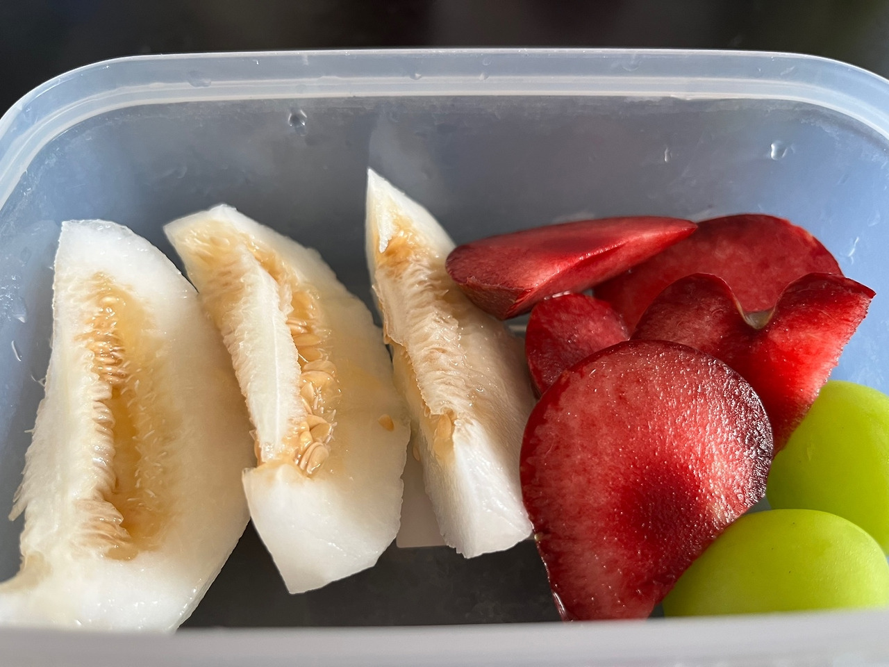 어머니는 식구들이 먹기 좋도록 미리 깎아둔다. 식사하고 바로 먹을 수 있도록 배려하는 것이다. 지금 어머니는 오른쪽 두 손가락 부상으로 물을 조심해야 한다. 식사 준비부터 상 차리고 설거지하는 과정에 딸 수고가 더해져야 한다. 어머니가 외출한 후, 과일 꺼내 종류별로 참외, 청포도, 붉은 자두를 먹기 좋게 잘라놓는다. 그녀 흉내내기이다.