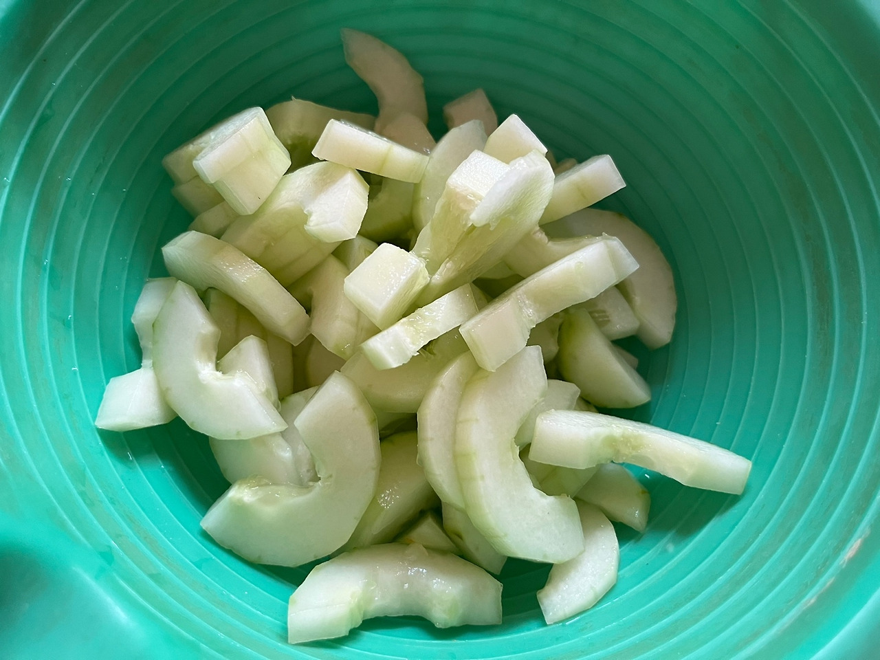 부지런한 어머니는 이웃이 건넨 노각으로 밑반찬을 만드셨다. 소금 뿌린 후 고춧가루와 참깨 더하면 금세 노각 무침 완성이다. 초록색 바가지에 연둣빛 노각이 청량해서 사진을 찍었다.