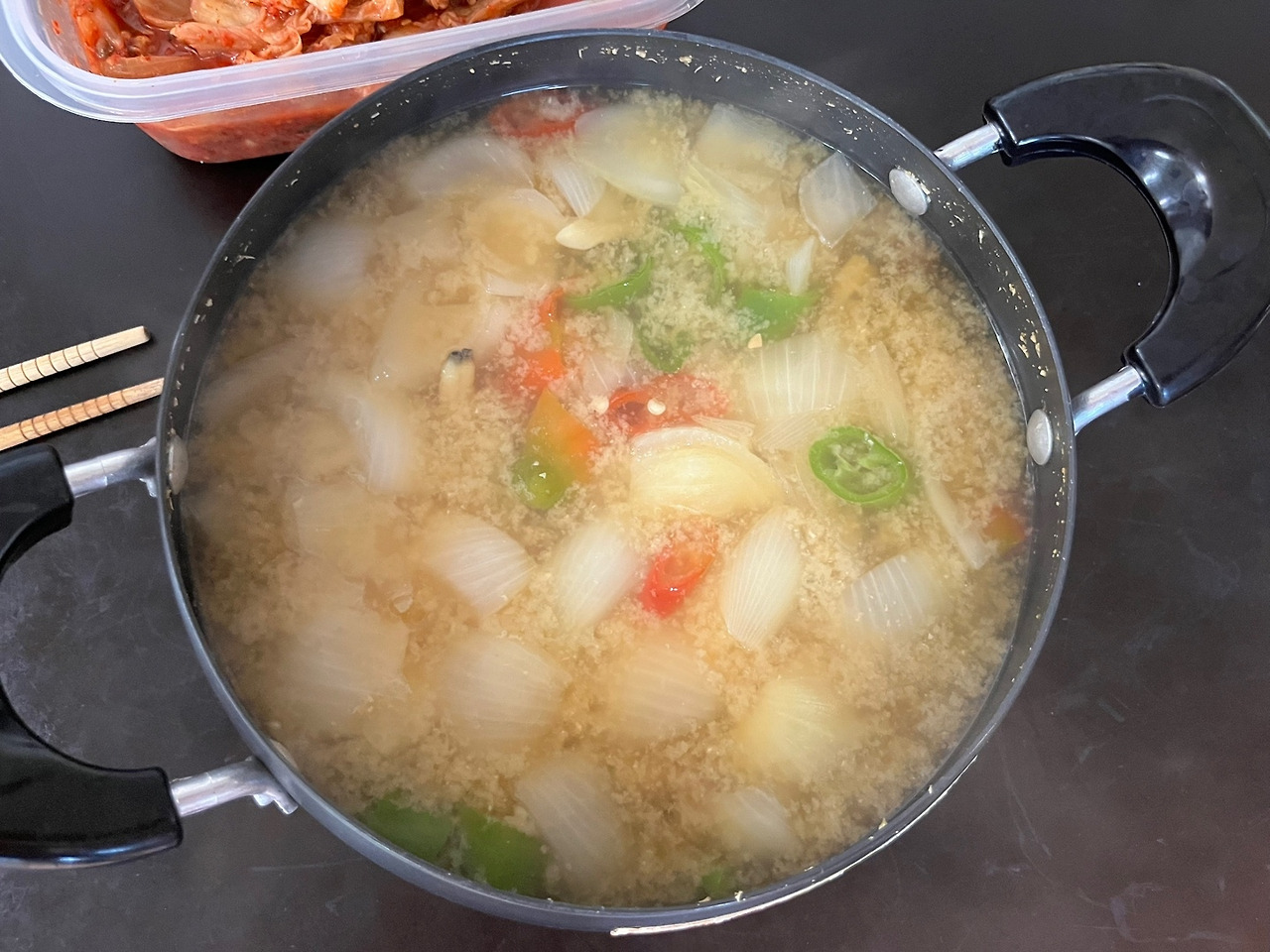 어머니가 손을 다친 후 처음 만든 찌개가 된장찌개이다. 조수로 고추 자르고, 양파 썰고, 된장통 뚜껑 연 것은 딸의 몫, 냉장고에 보관된 쌀뜨물을 냄비에 붓고 된장 풀어 농도 조절하고 냉동실에 있던 바지락 뭉치 넣은 것은 엄마 몫! 엄마와 딸의 컬래버. 된장찌개는 어머니가 다치고 나서 느림보 거북이 딸이 요리에 가담한 첫 작품이 다.
