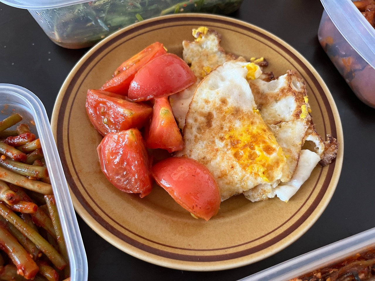 손은 크셔서 2인 밥상 차림에 계란 프라이는 3인분. 위생상 개인 접시에 다 옮겨 담아야 하나, 하던 대로 반찬통 그대로 올리고 먹는다. 대신 찌개는 개인 국그릇에 옮겨 담는다.