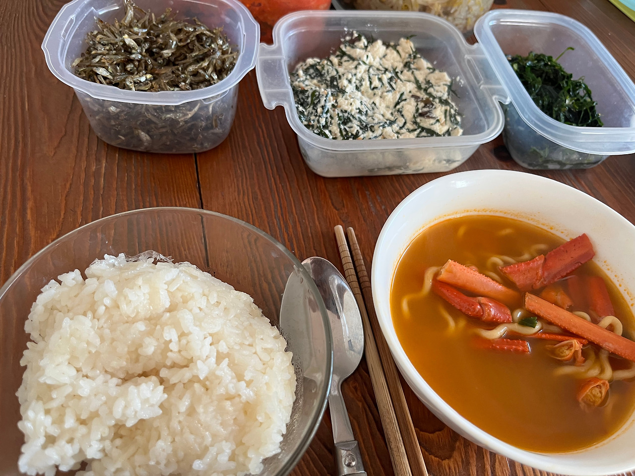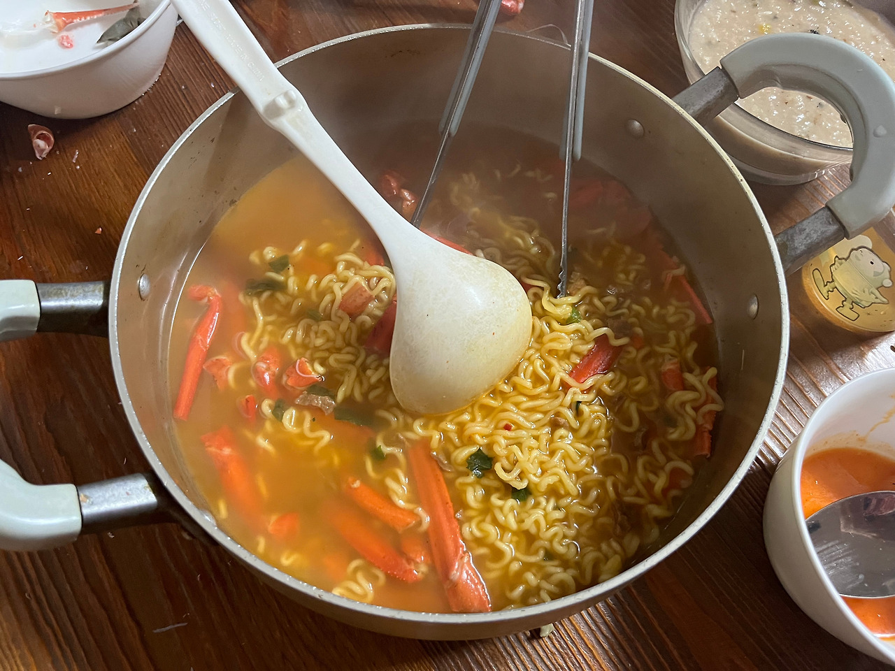 홍게 도착하기 전, 미리 해놓은 어머니표 국물 떡볶이도 한 그릇씩 뚝딱. 조카들이 좋아하는 로제 떡볶이나 엽떡은 맵기도 하고 뭔가 자극적이어서 내 스타일이 아니다. 건강을 위해 떡볶이도 자제해야 하지만, 이런 날은 일탈 그 자체. 동생과 막내 조카 요청에 따라 하나 남은, 매운맛 진라면에 홍게 다리를 잔뜩 넣어 해물탕면을 끓였다.