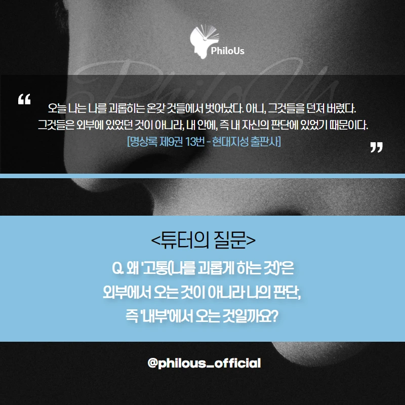 이번 글쓰기의 주제는 ‘괴로움’이었다. 아우렐리우스는 명상의 끝에 결국은 괴로움을 벗어내고 평안하게 되는 방법을 찾아낸 듯하다. 그가 평안함을 얻을 수 있었던 것은 자신의 내부에서 답을 찾아냈기 때문이었다. 그는 내부에서 어떤 답을 찾았던 것일까?