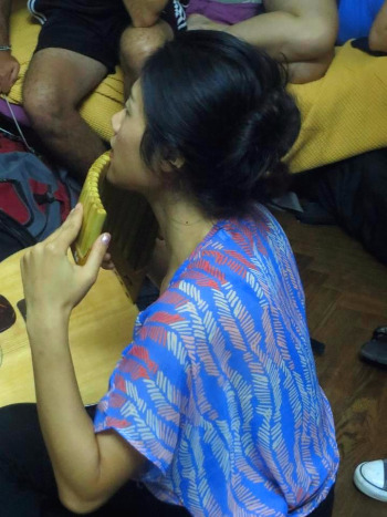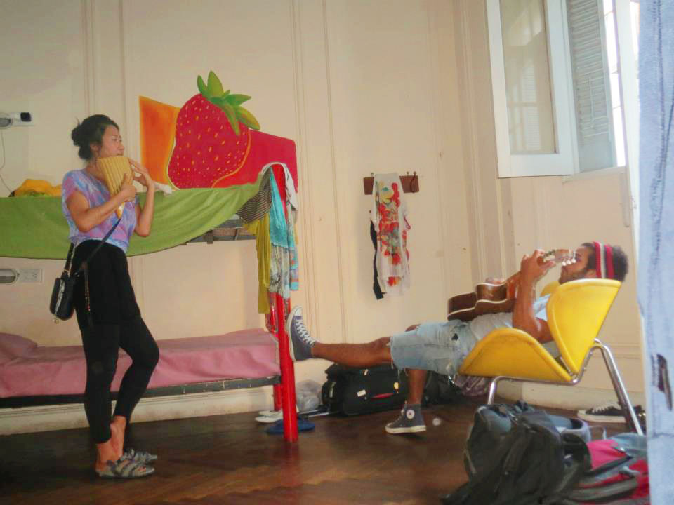 여러 명이 쓰는 방에 묵어서, 사람들이 계속 오고 갔다.