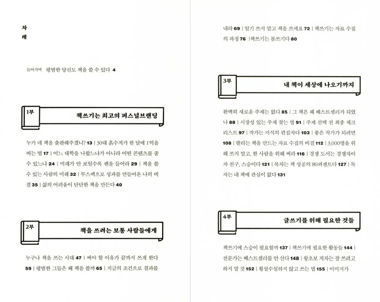 특히 책의 설계도인 목차가 책의 완성도 80%를 결정한다고 할 정도로 중요하다.