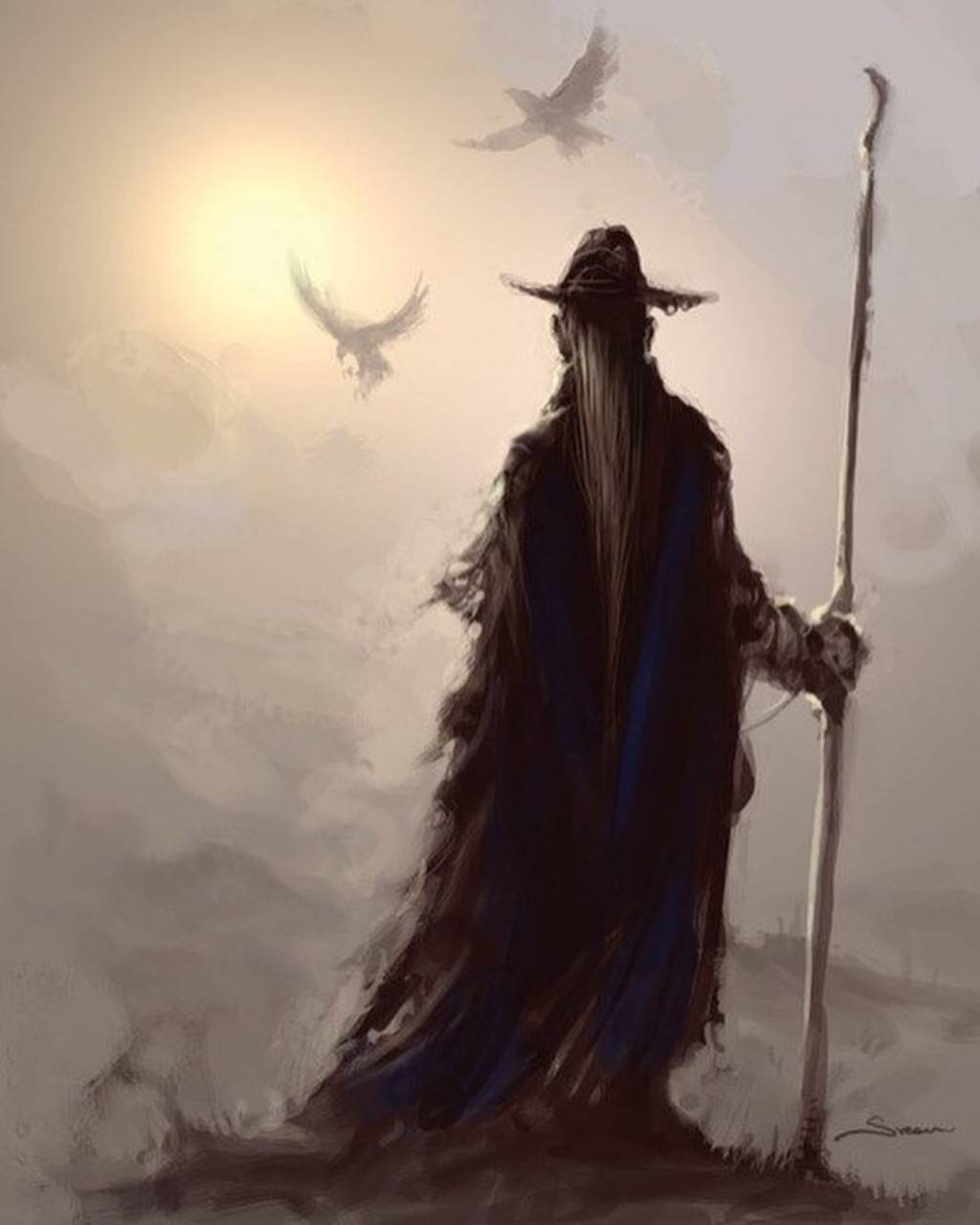 오딘은 애꾸눈을 감추기 위해 챙이 넓은 모자를 쓰고 다니며, 곁에는 후긴과 무닌이라는 까마귀 두 마리를 데리고 다니는 노인으로 형상화 된다. 미드 <바이킹스>에도 주인공인 라그나가 어떤 영감이나 계시를 받을 때 이 오딘의 모습이 형상화 되어 그의 눈 앞에 나타난다.