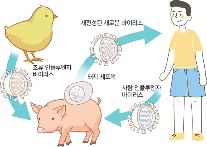 새로운 바이러스가 만들어지는 장소를 제공하는 숙주는 대개 오리나 기러기 같은 '물새'다. 야생 조류 몸 안에 존재하는 인플루엔자 바이러스는 사람에게 잘 감염되지 않지만, 돼지나 가금류 등의 징검다리를 거치면서 사람에게도 감염이 된다. 철새의 분변으로 오염된 물을 가금이나 돼지가 섭취하면 바이러스가 체내로 유입된다. 가금류는 금방 죽지만 돼지는 죽지 않고 오래 살아남아, 새, 돼지, 사람의 인플루엔자 바이러스가 서로 섞이는 숙주가 된다. 이렇게 바이러스의 유전자들이 한데 섞여 새로운 바이러스가 만들어지는 과정을 '유전자 재편성'이라 부른다.