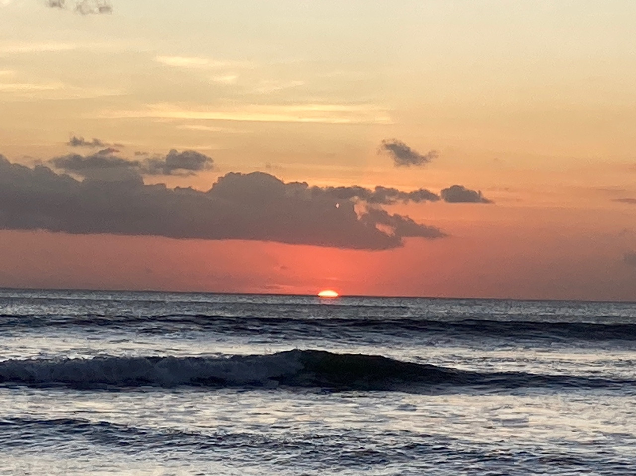 덕분에 발리에 머무는 지난 8일 내내 하루도 빠짐없이 선셋을 보러갔습니다. 심지어 허리를 다쳤을 때도, 허리를 부여잡고 기어가다시피해서 봤습니다. (그 결과 통증이 더 심해졌습니다만..) 이곳의 해지는 시간은 6시 30분 정도로 일년 내내 일정합니다. 가장 장관은 6시 15분 쯤, 이때 하늘과 바다가 온통 오렌지빛으로 물들며 수평선 전체가 오렌지로 물드는 광경을 불 수 있어요. 이걸 보려면 최소 6시부터는 스탠바이해야합니다. 백문이 불여일견. 사진과 영상을 통해 만나봅시다.