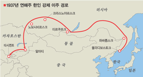 1937년, 이때 동포들에게 엄청난 사건이 일어난다. 스탈린은 고려인이 일본 첩자가 될 수 있다는 명목으로 이들을 아주 척박한 중앙아시아 등지로 강제이주를 시키고 만 것. 예고도 없었다. 지식인은 처형하고, 나머지는 화물차와 가축운반차를 개조해 짐짝처럼 실어날랐다. 매서운 시베리아 날씨 속에서 6천 km를 이동하는 동안, 수많은 사람들이 희생되었다. 한동안 이에 대해 발언하는 것조차 금지되었다. 1800년대 아메리카 인디언 부족들이 겪었던 참혹한 강제 이주 "눈물의 길 Trail of Tears"에 비견될, 처참한 길이었다.