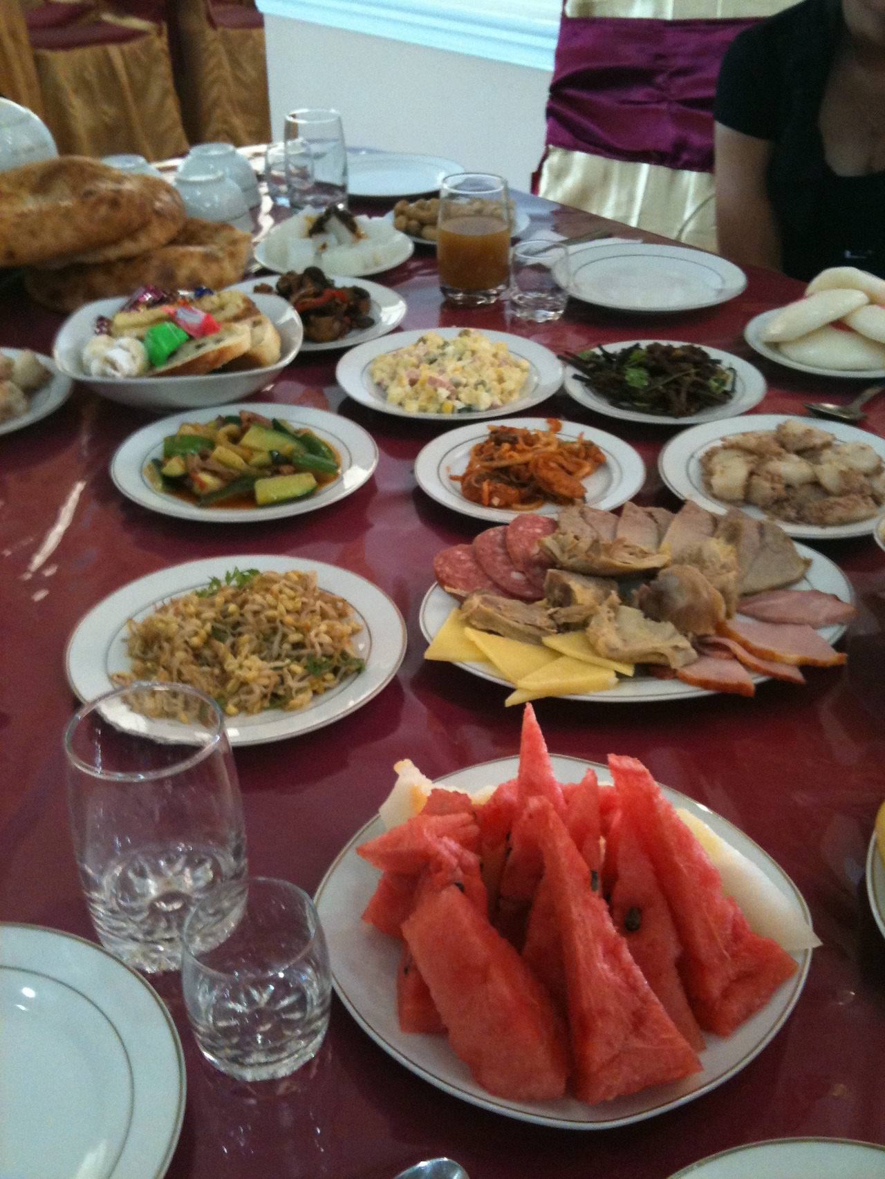건물의 모임공간을 대여해 음식을 펼쳐놓고, 노래방 기계도 두고 우리처럼 잔치를 벌였다. 안디잔(우즈벡의 동부 도시)에 사는 고려인들은 다 모인듯, 줄잡아 50~60명은 넘는 고려인들이 참석했다. 머리도 검고 얼굴도 동글납작하고 눈이 쭉 찢어진게 분명 한국인인데, 개 중 한국말을 할 줄 아는 사람은 아무도 없었다. 모두 러시아말로 대화하고 있었다. 나는 '스파시바' 말고 러시아말은 전혀 할 줄 몰랐기에, 조금 어색하게 테이블에 앉아 있었다. 그런데 잠시뒤 나온 잔치음식에 놀라고 말았다.