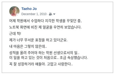 다 큰 어른이 아직 미성숙한 아이들 앞에서 성적을 올리기 위해 날마다 호통치고 얼르는 모습이 때론 비현실적으로 느껴졌다. 하지만 이 '무서운 선생님'에게 부모님들이 학생들을 점점 더 많이 보내기 시작하면서부터 나의 선택이 틀리지 않았음을 확신했다.