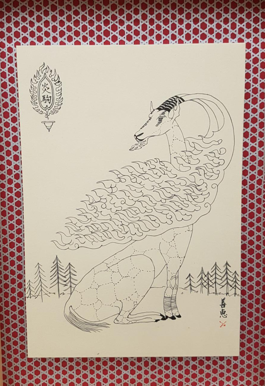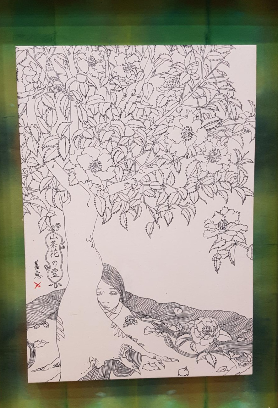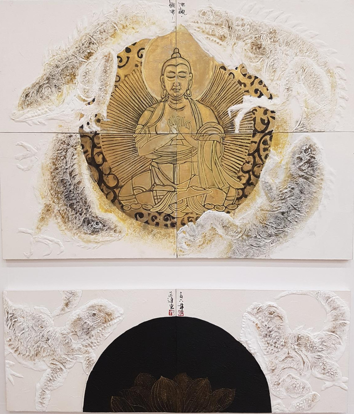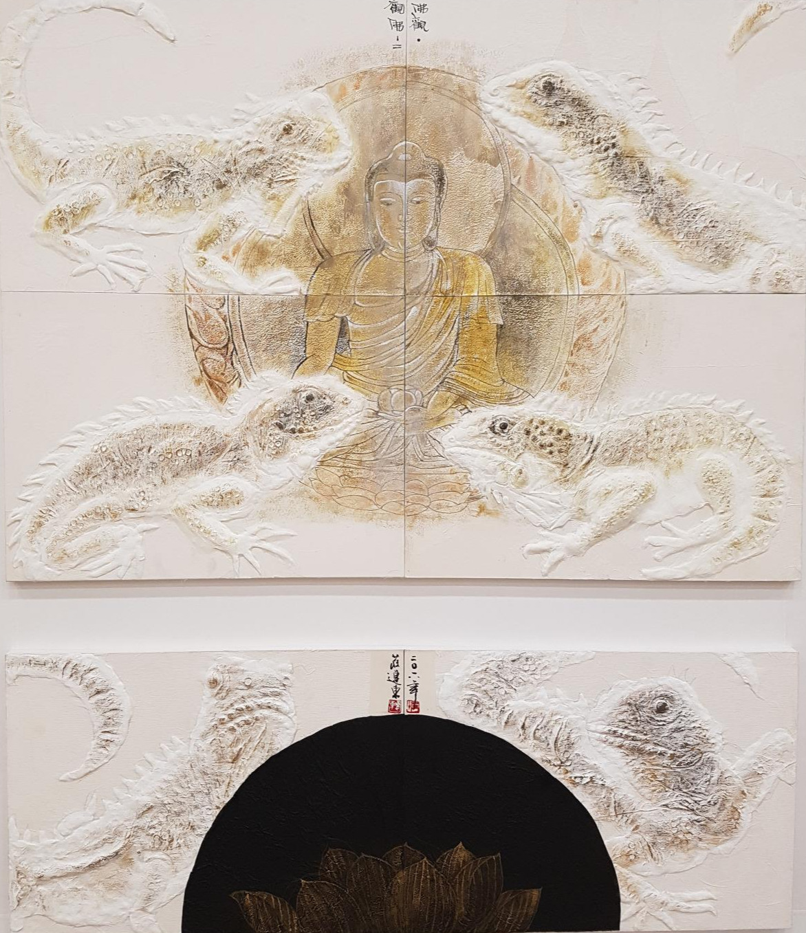 대만을 여행하면서 느낀 것은 특히나 절이 많다는 것이었다. 시장 골목을 가다가도 절이 있었고 도로변에 유명한 절이 있기도 했다. 불교를 기반으로 도교 및 민간신앙이 더해진 경우도 심심찮게 볼 수 있다. 위 작가의 작품에는 불교를 중심으로 하는 특징이 잘 나타났다. 우리도 흔히 알고 있는 연꽃과 부처의 모습, 다만 수묵이라고 믿기 어려운 정교함이 돋보였다.