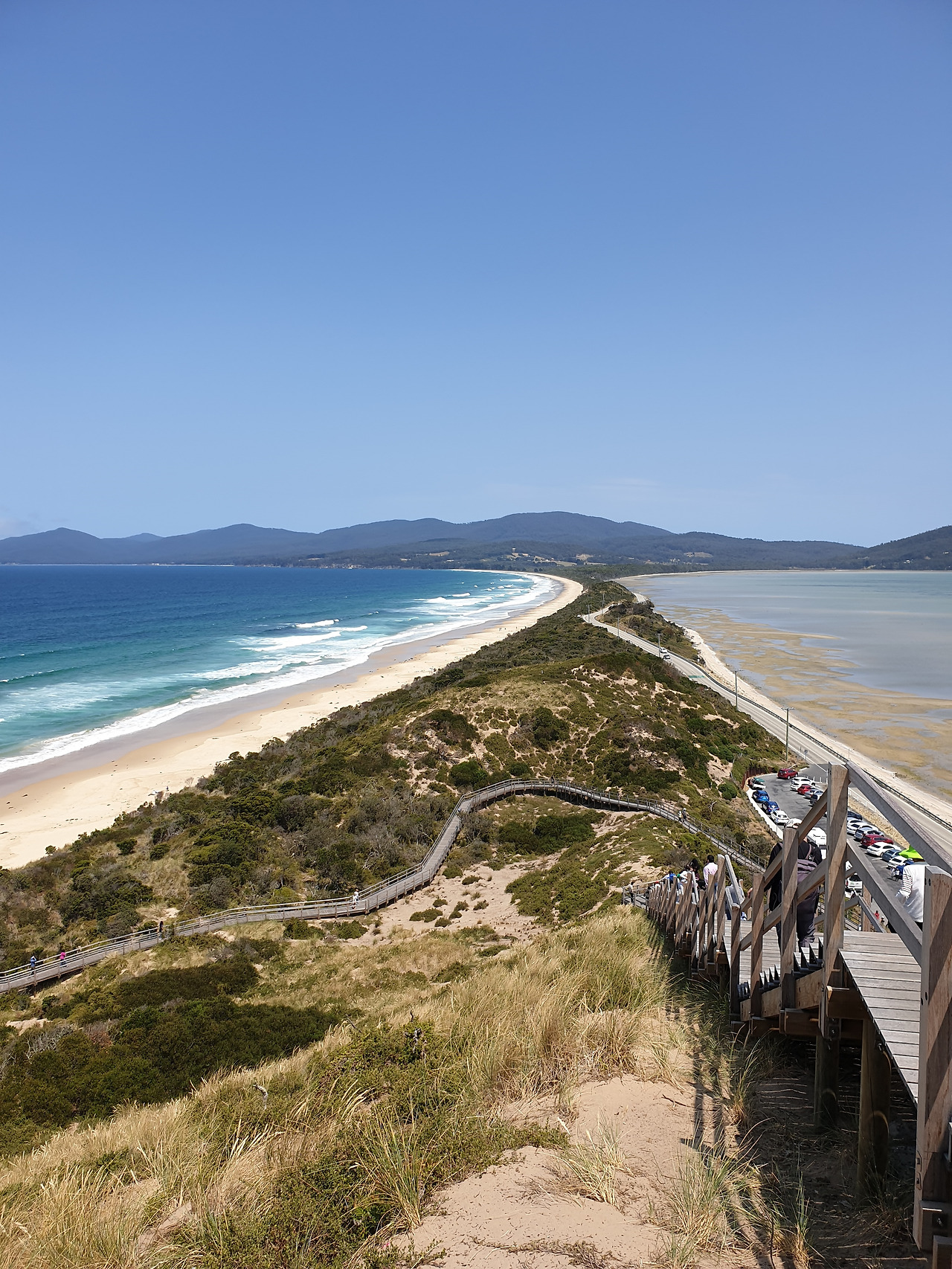 웰링턴 마운틴에서 내려와서 우리는 The Neck Lookout 이라는 명소를 가기 위하여 브루니 아일랜드로 향하였다. 브루니 아일랜드로 들어가기 위하여 카페리에 차를 싣고 약 15~20분 정도 바다를 건너가게 된다. 선착장에서 내려 20분정도 달리다 보면 The Neck Lookout이 나온다. 계단을 따라 전망대에 오르면 얇은 육지를 가운데 두고 양쪽으로 펼쳐진 아름다운 바다를 볼수 있다. 시간을 잘 맞추지 못하면 바닷물이 빠져 이 모습을 볼 수 없다고 하는데 우린 오늘 타즈메니아에 도착하였기에 시간을 맞출 여유도 없었고 운에 맡겼으나 다행히 양쪽 바닷물이 어느정도 차있는 광경을 볼 수 있었다.