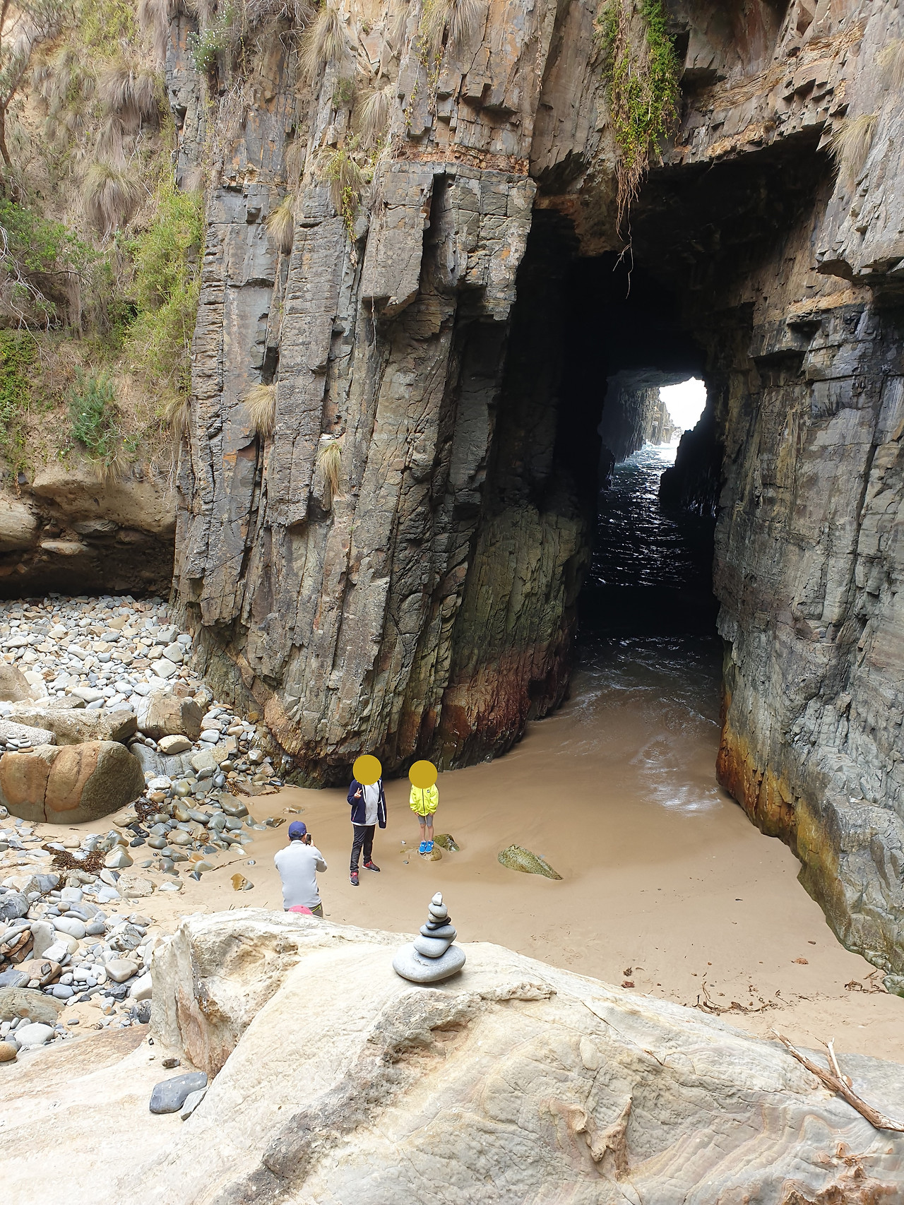 아쉬움을 남기고 포트아서를 떠나며 호바트로 돌아가는 길에 포트아서 근처에 있는 리마커블 동굴을 들렀다. 계단을 따라 10분 정도 내려가다 보면 바다를 향해 뚫려있는 바위동굴이 있는데 이 동굴 구멍으로 파도가 밀려들어온다. 지쳐서 이제 못 다닌다고 하던 아이들은 이 곳에서 밀려오는 파도를 피하며 한참을 깔깔거리고 즐거워하며 놀다가 결국은 쌀쌀한 날씨임에도 옷과 신발을 다 적시고 말았다.