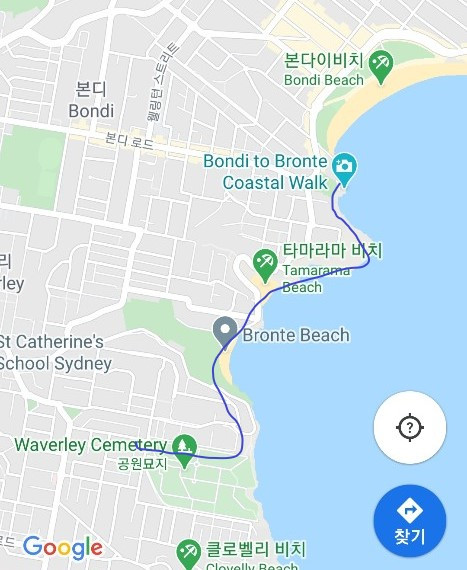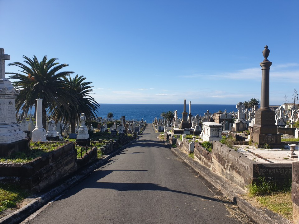 본다이비치에서 시작하여 산책로를 따라 걷다 보면 타마라마비치, 브론테비치가 연이어 나온다. 중간에 힘들면 비치 근처의 버스정거장에서 버스를 타고 본다이정션역으로 되돌아올 수 있다. 물론 코스탈 워크를 통해 계속 걸어 클로벨리비치, 쿠지비치를 거쳐 더 멀리도 갈 수 있다. 그러나 나에게는 벅차다. 오늘은 버스를 타고 웨이버리 공원묘지 근처에 내려 거꾸로 본다이비치까지 올라오며 걸어보았다. 처음 남편이 공동묘지에 산책 가자고 했을 때는 정말 무슨 소리야 했는데 이 공동묘지 경치가 엄청 좋기도 하고 산책하거나 자전거를 타는 사람도 많다. 그리고 엄청나게 넓은 묘지부지 둘레에는 주택들이 즐비하게 들어서 있다. 공원묘지 입구에서 바다를 바라보며 내리막길을 걸어 내려오면 경치가 매우 좋다.
