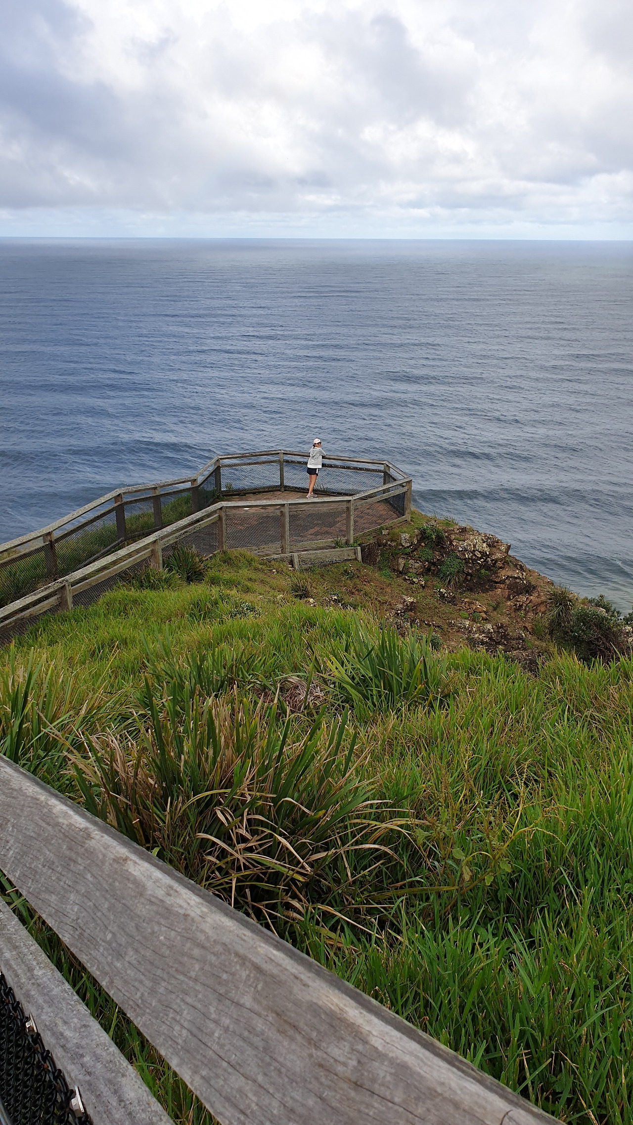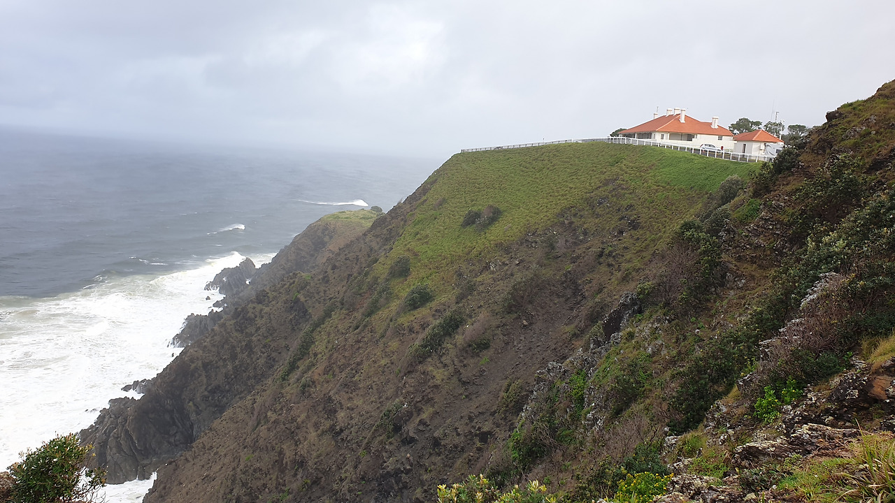 물론 바이런베이는 너무나도 인상적이고 아름다운 절경이었는데 문제는 비구름이 우리를 쫓아다니는 건지 한참 구경 중에 꽤 많은 양의 비가 바람에 흩날리며 우리를 적시기 시작했다. 우산을 써도 호주의 이런 바람 섞인 비에는 금세 옷이 다 젖게 된다. 그래도 이번 여행의 마지막 장소이기에 아쉬움에 등대는 물론 그 뒤의 산책로까지 곳곳을 구경하며 느긋하게 사진도 많이 찍었다. 그리고 축축함에 대한 보상인지 멋진 절벽과 바다에 선명한 무지개가 계속 걸려있어 기억에 남는 여행장면이 되었다.