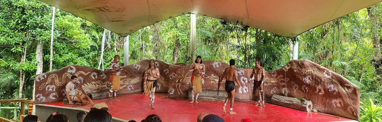 우리 가족끼리 렌터카로 왔다면 벌써 이곳을 떠났겠지만, 우린 또 열심히 에보리진 공연을 관람한다. 원주민 할아버지의 시범을 보고 같이 부메랑을 던져보기도 하고 원주민 공연도 관람하였다. 재작년 뉴질랜드에서 마오리족의 공연을 본 적이 있었는데, 사실 별다른 기대 없이 봤는데(이것도 묶음 티켓을 구입하는 바람에) 뜻밖에 정말 힘 있고 특색 있는 공연에 아이들이 무척 즐거워했었다. 그런데 이번 공연은 뭔가 어설픈데, 우리 아이들도 잘 추는 게다리춤이 주를 이루고 원주민 공연을 하는 젊은 분들은 왠지 스스로도 어색해하는 모습이 에보리진이 아니고 워홀로 오신 분들 같은 느낌이 드는 공연이었다.