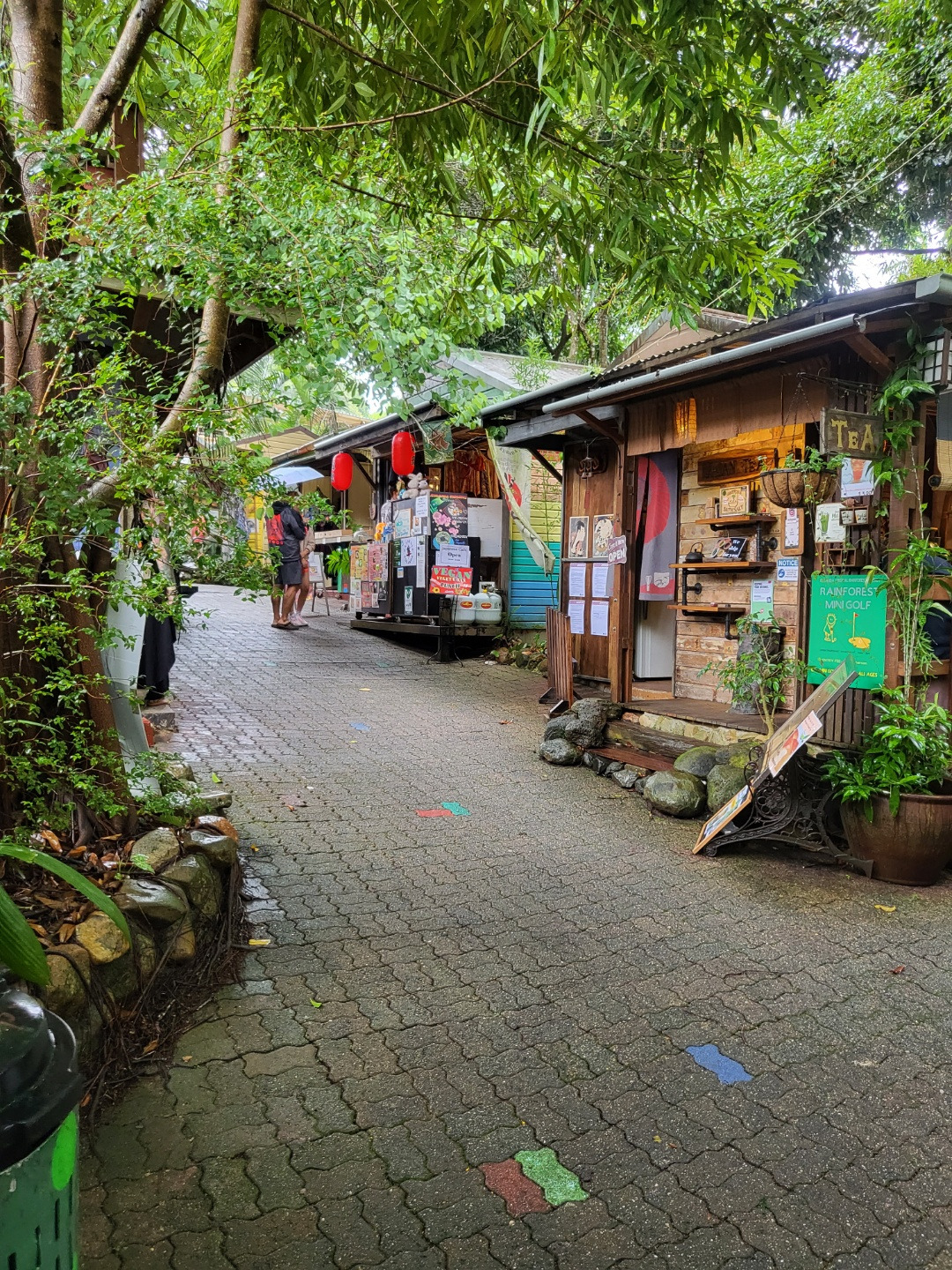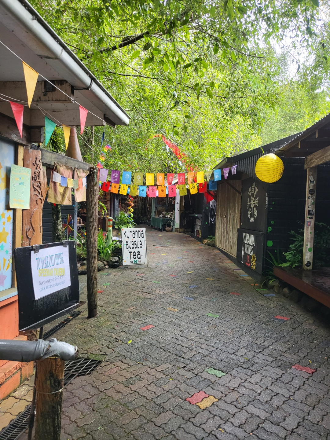 이렇게 오전 관광을 마무리하고 드디어 우리를 데리러 온 관광버스를 타고 쿠란다 마을에 도착하였다. 버스에서 내리자 비가 쏟아지기 시작한다. 제일 가까운 크레페 식당에 들어가 점심을 먹으며 비가 잦아들기를 기다려 보지만, 비는 멈출 생각이 없고 생각보다 오래 식당에 머무르고 말았다. 장대비가 가랑비로 바뀌면서 우리는 비를 맞으며 쿠란다 마을 구경을 시작해 보았다. 아기자기한 기념품 가게들이 주를 이루고, 더 안쪽으로 들어가면 주전부리를 파는 작은 상점들이 줄지어 있는 아기자기한 골목이 나온다. 일본 주전부리 가게들이 꽤 있고 그곳 주인들이 일본인이기도 해서 문득 쿠란다란 지명이 일본어인가 하는 생각이 들기도 했다. 비만 오지 않았으면 더 잘 구경할 수 있었을 것 같은 아쉬운 마음을 뒤로한 채 쿠란다 시닉 열차를 타러 갔다.