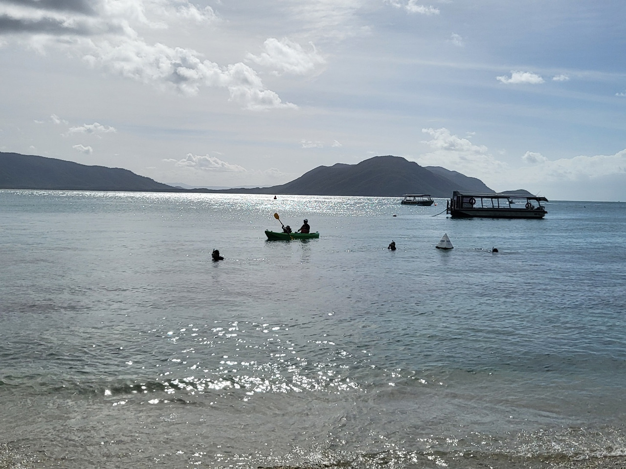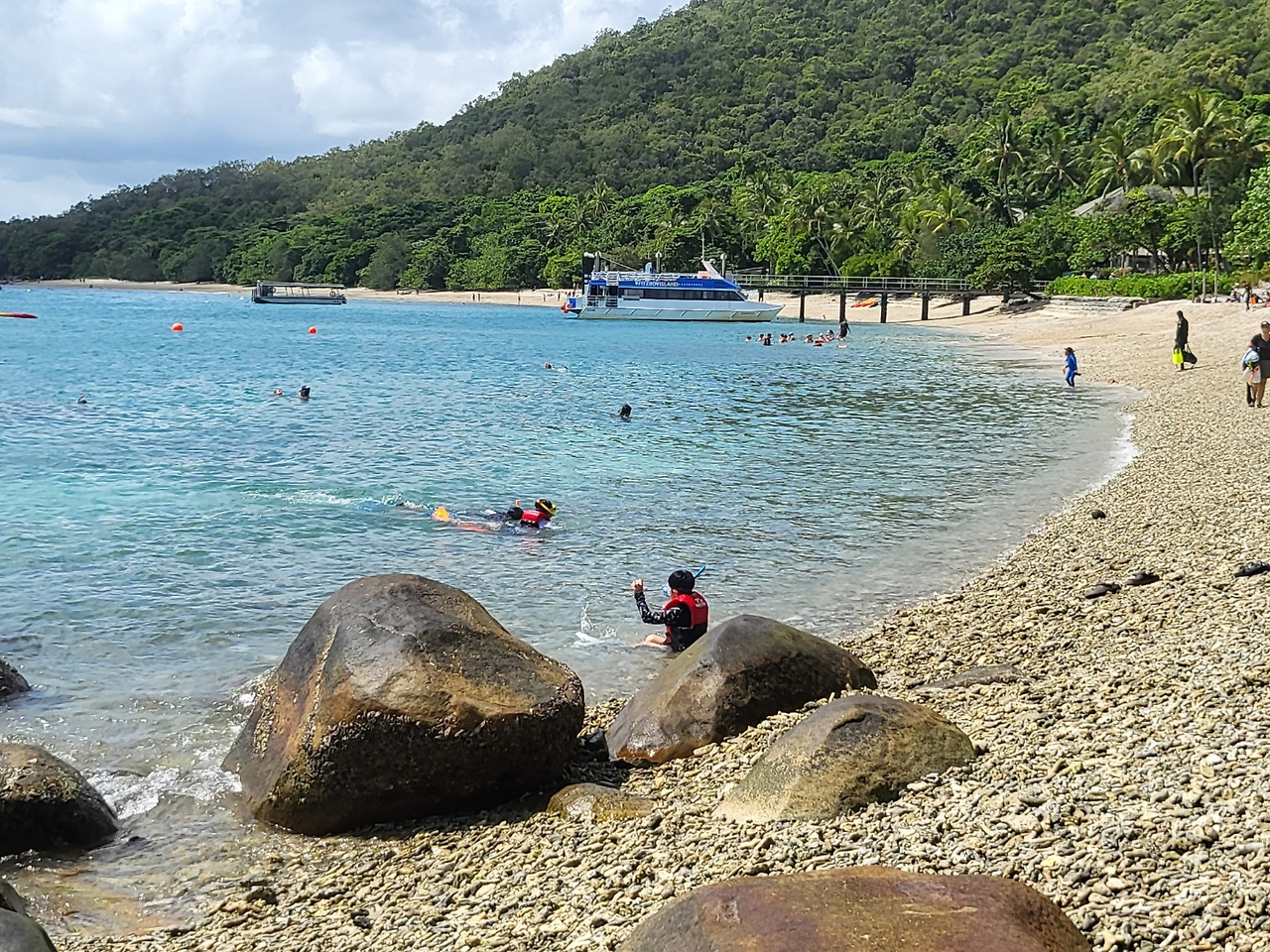 드디어 배가 피츠로이 아일랜드 선착장에 도착하고 우리는 서둘러 내렸다. 땅을 밟으니 멀미가 나아지는 것 같았다. 조금 걸어 들어가 한적한 해변에 자리를 잡자마자 마음이 급해진 우리 둘째 아이는 서둘러 스노클링 장비를 착용하고 바다로 뛰어들었다. 피츠로이 아일랜드의 해안은 고운 모래사장이 아니라 죽은 산호가 깔려있는 해변으로 맨발로 걸으면 아픈 그런 곳이었다. 바다는 꽤 멀리까지 나가도 그리 깊지 않았지만 아이들을 혼자 내보내는 것은 불안하기에 아빠가 한 명씩 번갈아가며 멀리 스노클링하여 왔다 갔다 하느라 고생이 많았다.