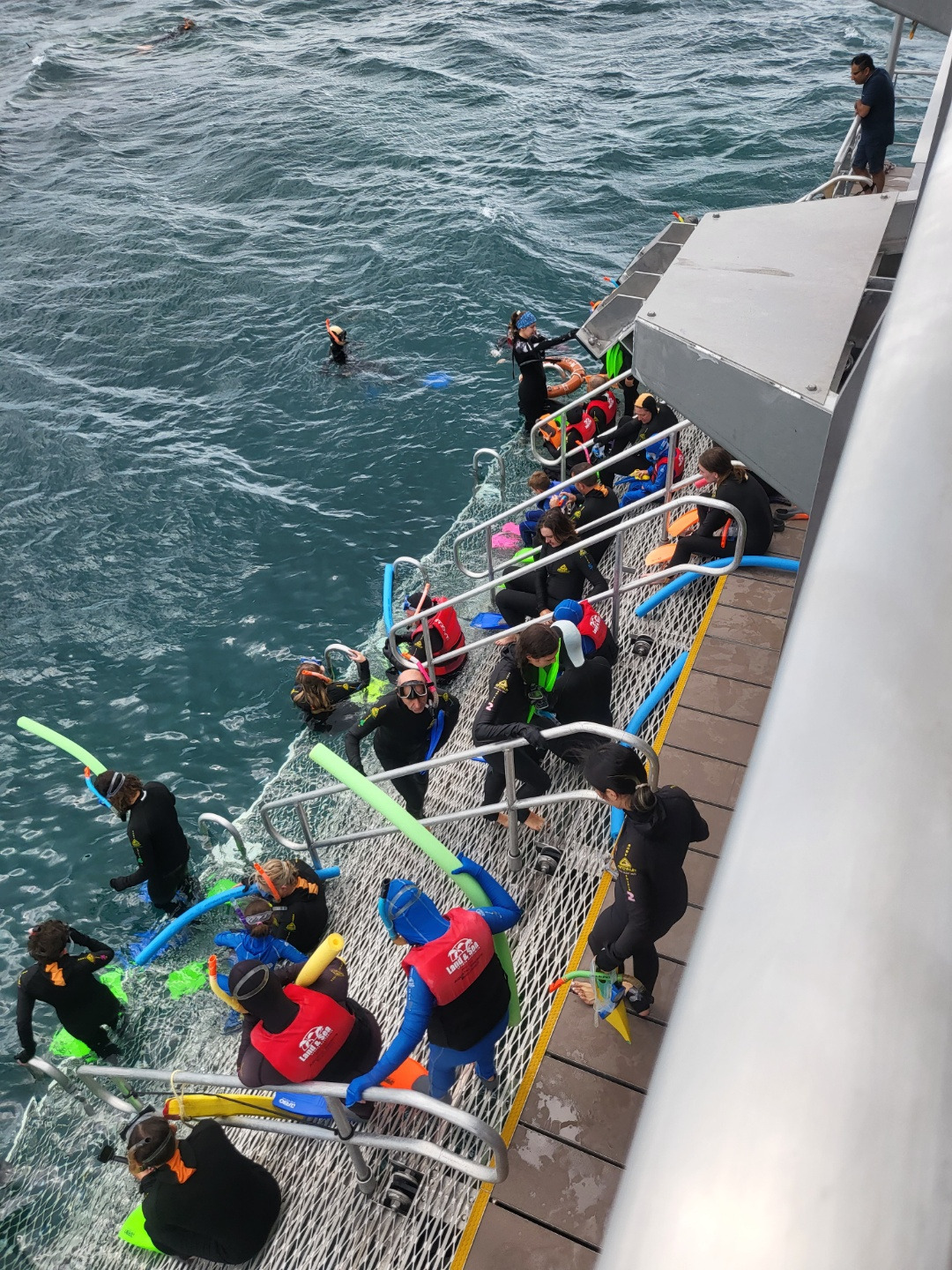 1시간 반을 출렁거리며 가서 망망대해에 커다란 해상 정박정에 도착했다. 아, 진심 그런 곳인지 몰랐다. 그 정박정 한쪽에서 스노클링을 하고 다른 쪽에서는 헬기 체험할 사람들을 태울 헬기가 떴다 내렸다 했으며 또 한쪽에서는 유리 반잠수정 관광객들 태우고 들락날락 했다. 문제는 이 정박정도 바다의 출렁임에 따라 출렁출렁한다는... 이미 1시간 반의 뱃멀미에 지친 우리 딸과 나는 정말 당황하지 않을 수 없었다. 타고 온 배가 덜 흔들리는지 정박정이 덜 흔들리는지 심각하게 고민하기도 했다.