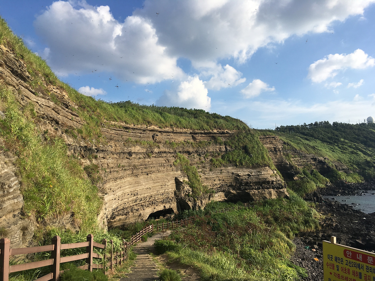 특히, 수월봉의 서쪽 해안 일대에서는 연안 조류와 해식 작용으로 깎인 절벽을 볼 수 있다. 아래로는 산책길이 있어서 걸어내려가면 좀 가까운 곳에서 경이로운 자연의 신비를 마주할 수 있다. 이곳에 오면 왜 여기가 화산학의 교과서라 불리는지 실감이 난다. 미리 문의하면 마을 해설사를 통해 자세한 설명을 들으며 정상까지 오를 수 있으니 참고하자. 수월봉 아래로는 엉알해안산책코스가 있어 트래킹을 하기에도 좋다.