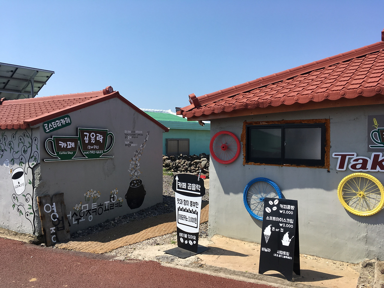 자전거를 타고 얕은 언덕을 가로질러 반대편으로 내려가 보면 카페 하나를 볼 수 있다. 어깨춤을 들썩이게 하는 노랫소리가 쿵쾅쿵쾅 카페 밖으로 흘러 나온다. 어느 상점이든 노랫소리가 담벼락을 넘은 건 이곳이 가파도에서 유일하다. 커피, 소프트아이스크림, 커피콩빵 모두 가격에 비해 맛이 좋다.