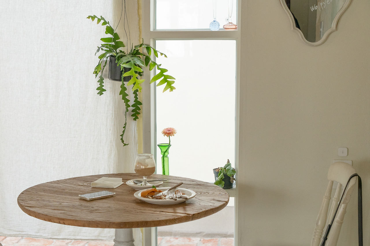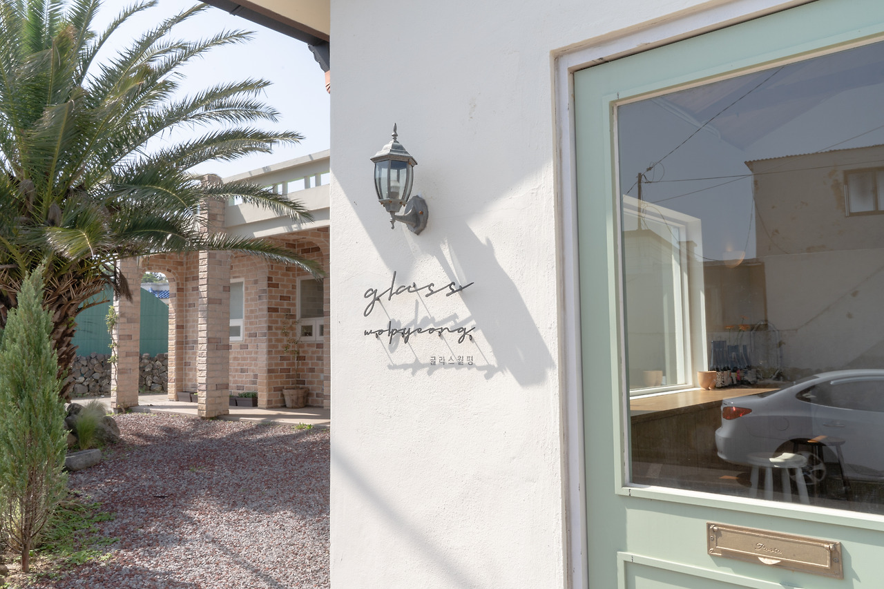 그곳에서 아주 마음에 드는 카페를 발견했다. 정확히는 카페 겸 와인바 '글라스 월평'이다. 옅은 베이지톤 외관에 민트색 문. 커다란 야자수와 클래식 조명까지. 외관만으로도 지극히 개인적인 나의 카페 취향에 딱 맞아 들어왔다. 원래 민트색이 이리도 예뻤었나에 대해서도 잠시 생각했다.