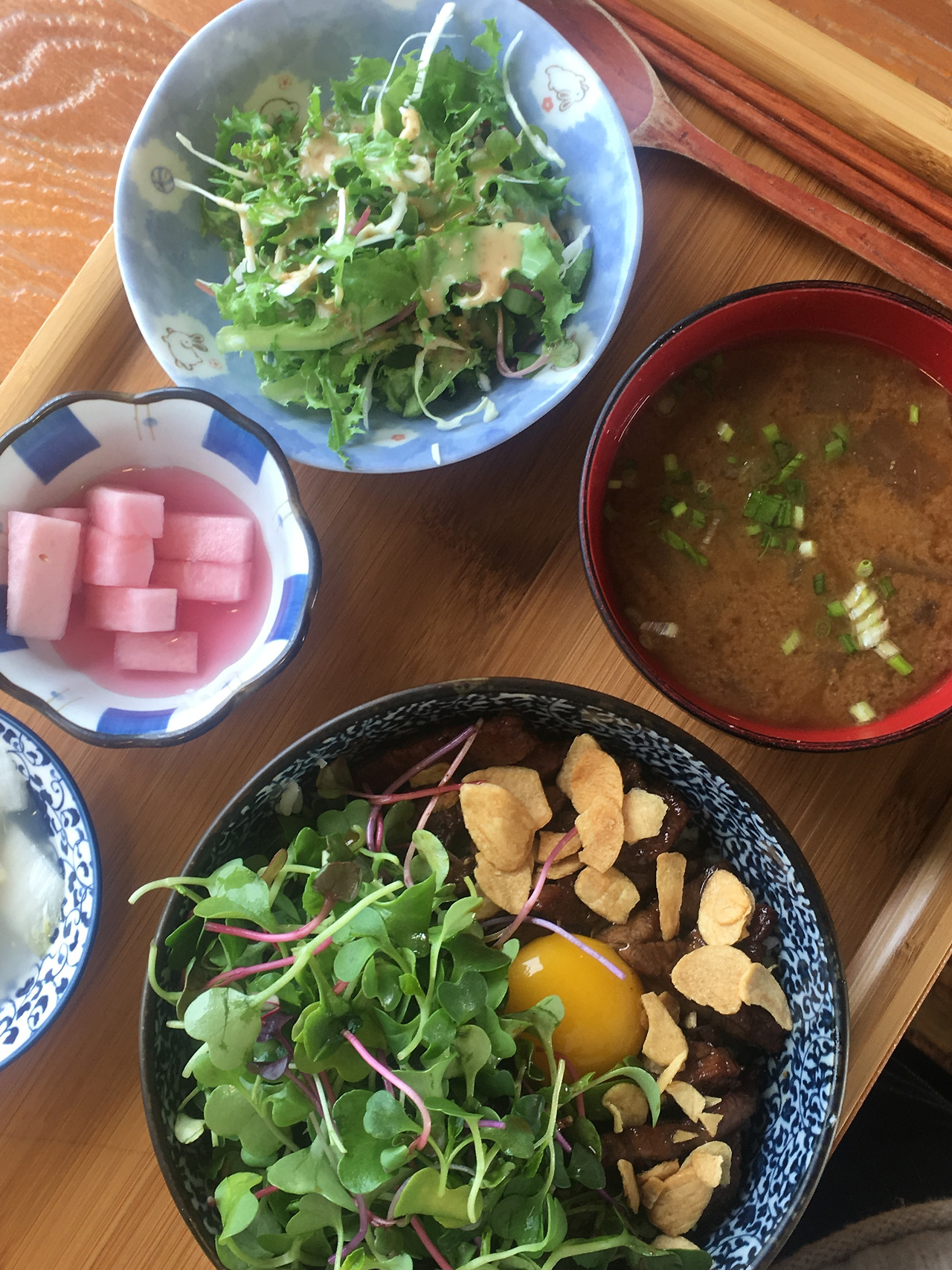 커다란 그릇에 넉넉하게 담긴 밥, 간소해 보이지만 밥과 딱 맞아떨어지는 신선한 밑반찬, 돼지고기와 야채를 삶아 된장 베이스로 만든 국물 톤지루.