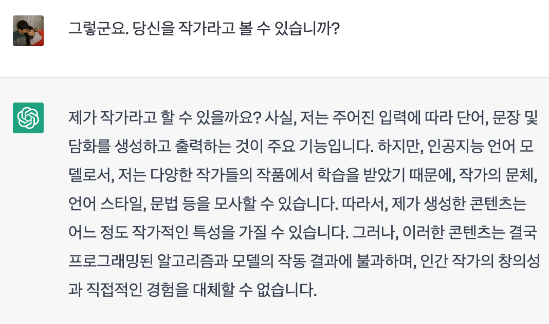막상 브런치 스토리를 시작하고 나니 아기를 돌보면서 글을 쓰는 건 생각보다 더 어려웠다. 아기의 패턴에 따라 글쓰기의 흐름도 들쭉날쭉하기 때문에 한번 끊기면 다시 이어 붙이기까지 꽤 많은 힘이 필요했다. 특히나 글을 쓰면서 주제를 완성해 나갈 때는 더욱 그렇다. 다시금 챗 GPT가 눈엣가시가 된 것도 마무리 문단에서 헤매던 날이었다. 잠시 환기나 하려고 SNS 둘러보기 중이었는데 어떤 이의 필력을 칭찬하며 인공지능이 쓴 것 같다는 댓글을 보았다. 사람이 쓴 글을 보고 챗 GPT 같아서 최고라 칭찬하다니. 하다 하다 이제 글쓰기 능력까지 인공지능에게 역전당한 것인가? 그렇다면 지금 한 문단조차 마치지 못해 빙빙 돌고 있는 나는 인공지능보다 못한 것인가? 그러다 이내 어차피 남들도 다 쓸 텐데 나도 챗 GPT 씨에게 마지막 문단을 좀 부탁할까 싶기도 했다.