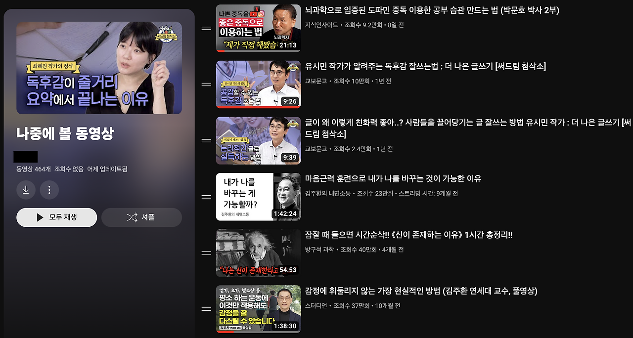 하지만 자기 계발 방법으로서 유튜브는 쉽지만 효과는 거의 0이다. 영상은 자동으로 흘러가기 때문에 집중하지 않으면 내용을 캐치할 수 없다. 거기에 난 화면은 보지도 않고 듣기만 하니 집중력이 더 떨어져 그냥 흘려보내기 딱 좋은 환경이다. 심지어 쉰다고 눈까지 감아버려서 내용의 95%는 꿈속에서 들었다고 보면 된다. 그러니 꽤 많은 영상을 봤지만 머리에 남는 건 하나도 없었다.