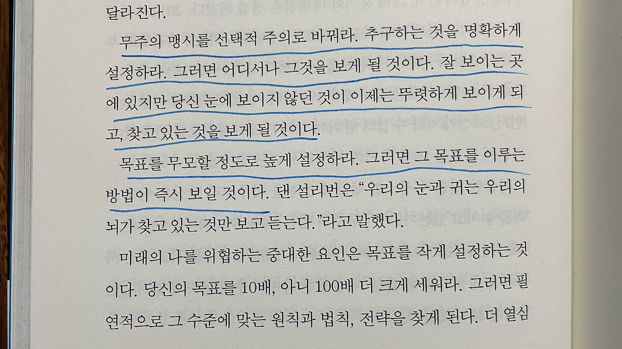 <시크릿>을 필두로 많은 자기계발서와 자기 계발 유튜브에서 끌어당김의 법칙을 주장하지만 나는 믿지 않는다. 앞서서도 이야기했듯 ‘행동’을 해야 변화가 생기고, 행동하지 않으면 어떤 것도 변하지 않는다고 나는 생각한다. 그러니 행동과 상관없이 상상만 하면 결과를 끌어당길 수 있다는 이야기는 납득하기가 어렵다. 책에서도 분명 “먼저 행동하는 사람이 ‘돼야’ 행동할 수 있고, ‘행동해야’ 얻을 수 있다”라는 말을 인용하며 ‘행동’의 중요성을 강조한다. 행동을 더 유발할 수 있기에 상상을 강조하는 것이라면 이해할 수 있겠지만, 그럼에도 조금 과격하게 생략된 것 같다는 생각이 들었다.