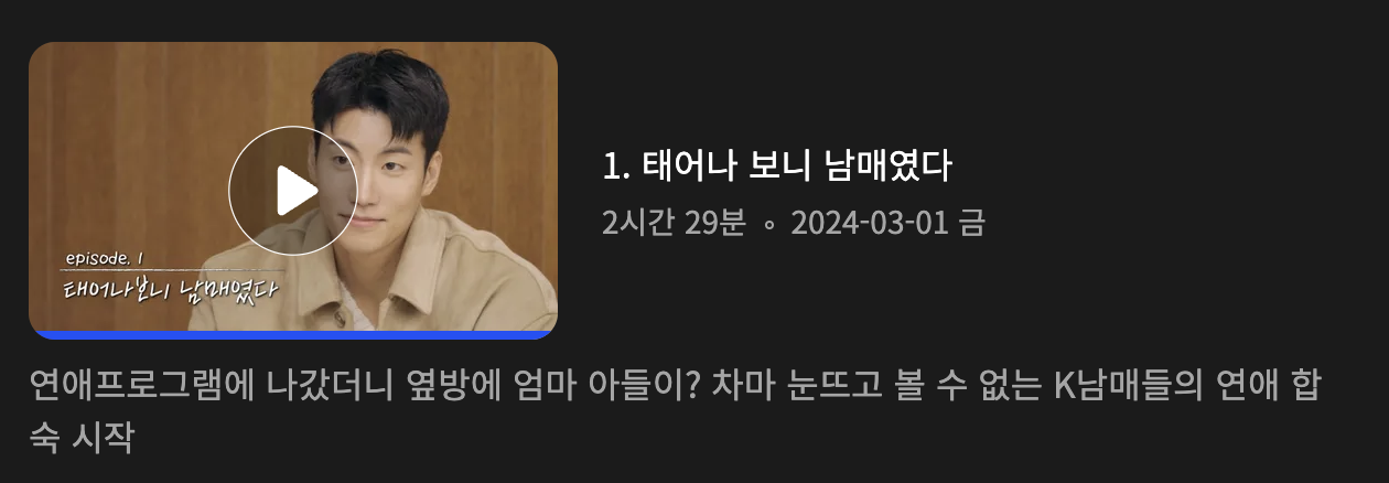 많은 기대를 하고 봤지만 <연애남매>가 내 취향의 프로그램은 아니었다. 굳이 재미 포인트가 나올 때까지 기다리면서 계속 보기에도 <연애남매>는 너무 길다. 그래서 난 진짜 재밌다는 평이 많지 않으면 다시 찾아보지는 않을 것 같다. 혹시나 재미있다고 하면 그때 가서 다시 보고 다시 리뷰를 쓸 수도 있다. 하지만 내가 <연애남매>를 다시 볼 수 있을지 개인적으론 좀 회의적이다.