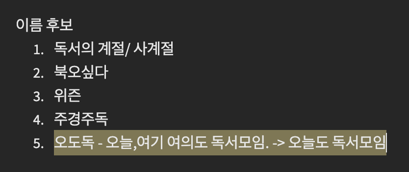 무슨 아직 시작도 안 한 모임에 이름이 필요한가 싶지만 우리는 안되더라도 제대로 해보자는 마음을 가지고 시작했기에 거창하게 정하게 됐다. 사실 모임 이름을 정하는 것이 가장 어려웠다. 막상 무언가를 떠올리려 하니 창의적인 이름이 떠오르지 않았던 것이다. 이름을 정하기 전까진 주말 아침 독서 모임이라고 적었다. 결국 우리가 회의하는 그 순간 정하기엔 다소 무리가 있었기에 시간을 들여 몇 가지 생각해보고 그중에서 고르기로 했다. 나는 여러 사람들에게도 물어보며 의견을 구했다. 그러던 중 회사동기가 "오지는 여의도 독서모임"을 줄여서 [오도독]은 어떠냐고 추천해줬다. 오진다라는 표현이 다소 마음에 들진 않았기만 오도독이라는 단어는 꽤나 입에 착 감겨서 포기할 수 없었다. 그래서 오진다는 표현을 놔두고 내 맘대로 [오늘, 여기 여의도 독서모임]이라고 적어서 투표를 하게 됐다.