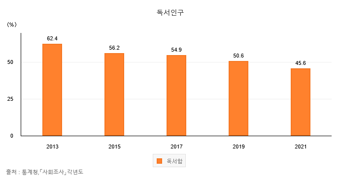 오른쪽의 그래프는 13세 이상 인구의 1년간의 독서 여부에 대한 지표이다. 학생 및 재수생이 읽는 교과서 및 학습참고서는 제외한 결과이며 이 통계에서 볼 수 있듯이 독서를 하는 사람들은 계속 줄어들고 있다. 이런 시국에 독서모임을 만들어본 경험을 과연 몇 명이나 해봤는진 알 수 없는 일이다. 결국 나는 아무것도 모르는 상태로 독서모임을 구성하는 순서를 5가지로 크게 나눴다.