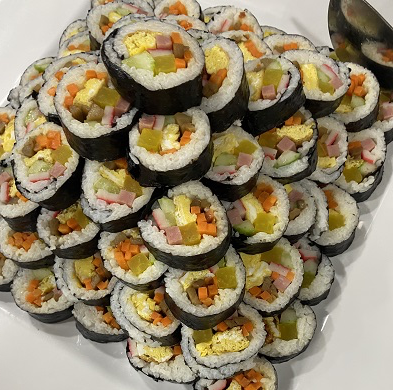 뷔페 김밥은 항상 이런식으로 높이 쌓여져 있었는데 차곡차곡한 모습에 더 끌려서 접시에 담았던것 같다. 물론 퍼오고 나면 엄마가 "뷔페에 와서 무슨 김밥을 먹냐~"하셨지만 나는 한 두개라도 꼭 가져왔다. 지금은 훨씬 예쁜 캘리포니아롤 등이 생겼지만 나 어렸을때는 김밥만 있었다. 그마저도 밥이 잔뜩 들어간...
