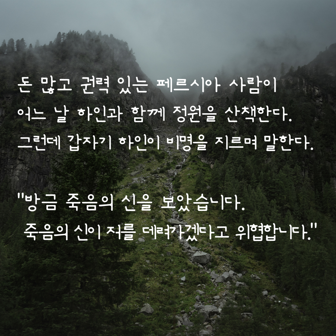 서머싯 몸의 <테헤란에서의 죽음>에서 하인은 죽을 운명을 받아들이지 못하고 도망치지만 결국 죽음으로 향해 간다. 하이데거의 말처럼 인간은 죽음을 향해 가는 존재이다. 오직 인간만이 자신의 죽음을 자각하며 살아가는 유일한 존재이며, 그것은 어쩌면 큰 축복이다. 삶의 유한함을 알기에 현재를 소중히 살아갈 수 있다. 작가 앤 라모트는 『쓰기의 감각』에서 이렇게 말한다.
