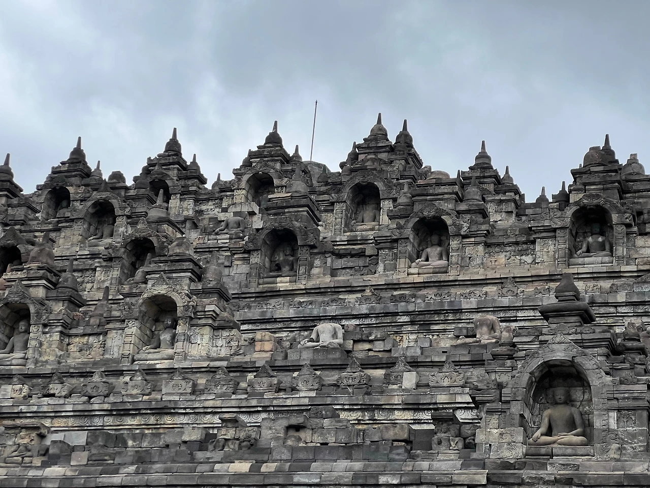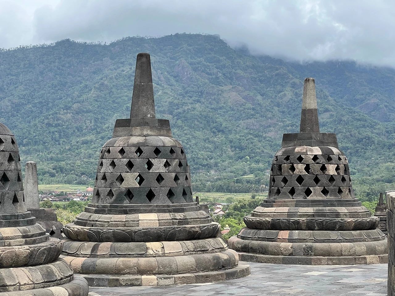 보로부두르는 층층히 쌓인 사각형 기단 위에 원판 형태의 제단이 얹어져 있는 형태의 사원이다. 각 층마다 정교한 조각들이 새겨져 있고, 꼭대기에는 불상들이 모셔져 있는 고깔 모양의 불탑들이 있다. 우리는 보로부두르 관광 이후 수라바야로 향하는 기차를 타야 했기에 시간이 없어서 가이드에게 양해를 구하고 사원 관람 중간 쯤, 먼저 꼭대기까지 올라가서 불탑들을 보고 내려왔다. 보로부두르 사원 꼭대기에서는 정글 지대의 풍경이 한눈에 들어오기도 한다.