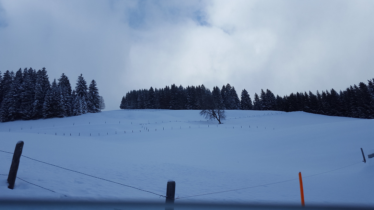 하지만 즐거운 기분은 한순간이었다. 그뤼에르로 가는 길에 두 번의 시련이 있었다. 첫 번째는 눈길이었다. 지리를 전혀 모르는 해외이고 의지할 건 차량 내비게이션뿐이었기에 우리는 내비게이션이 안내하는 길로만 따라갔다. 한동안은 포장된 길로 달렸지만 어느 순간부터 길이 사라졌다. 아무도 지나가지 않은 하얗게 쌓인 눈길에 바퀴 자국을 처음 새기며 계속 길을 따라갔다. 길은 점점 언덕으로 향했다. 산까지는 아니었지만 꽤나 높은 언덕이었다. 아마 저 언덕을 넘어가는 길이 그뤼에르로 가는 빠른 길이 아닌가 싶었다. 하지만 문제는 언덕길에 펜스가 전혀 없었고 포장된 길이 아니라 눈으로만 덮여 있었기 때문에 브레이크를 잘못 밟았다가는 차가 언제 미끄러질지 모르는 상황이었다. 함께 간 친구들 모두가 운전에 꽤나 자신이 있는 친구들이었고, 그중에서도 운전을 잘하는 친구가 운전을 하고 있었다. 그럼에도 불구하고, 모두가 긴장한 상황이었고 친구 역시도 자신이 지금까지 운전한 것 중 가장 위험한 순간인 것 같다고 했다. 말 그대로 기어가는 속력으로 최대한 안전하게 언덕을 올랐고 무사히 그 길을 벗어날 수 있었다. 지금 생각해도 이번 여행에서 가장 아찔한 순간 중 하나로 기억된다. (또 한 번의 순간은 이탈리아에서 맞이하게 된다.)