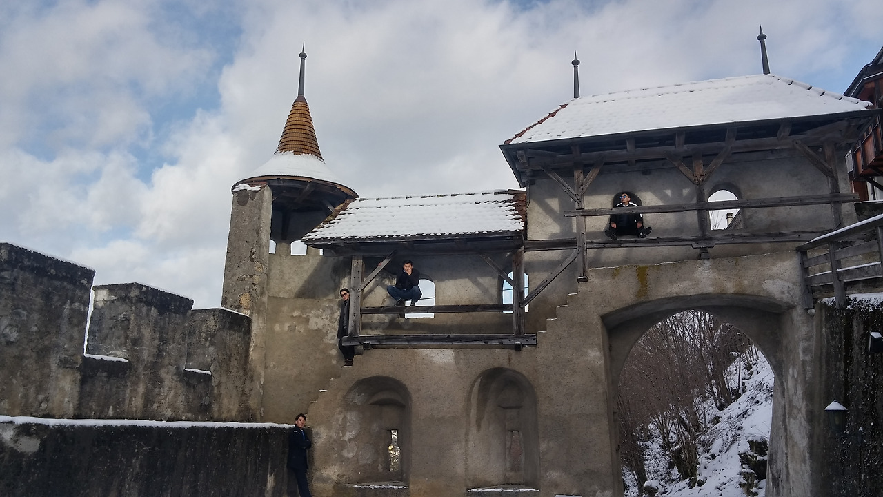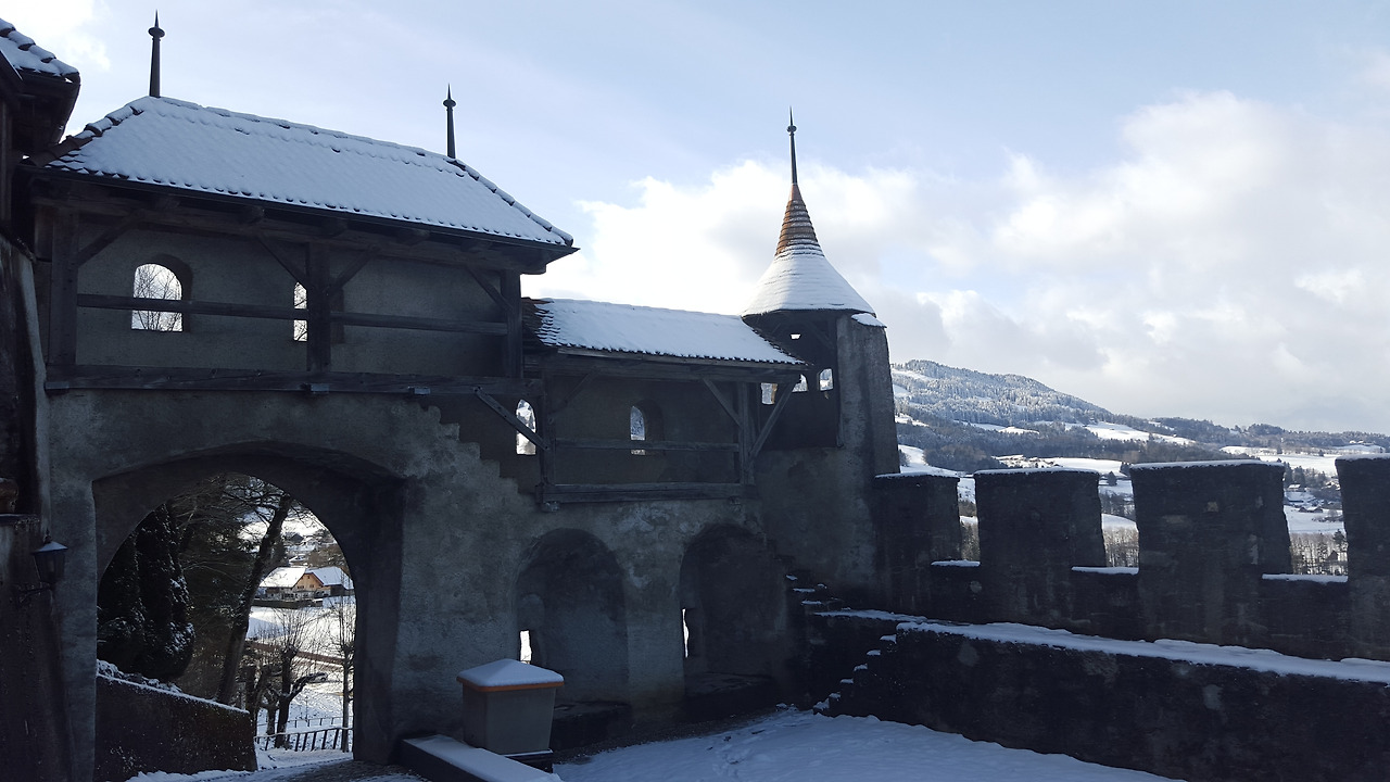 식사를 마치고 마을을 잠시 둘러보았다. 작은 중세마을에는 주 도로를 제외하고는 눈에 흔적이 여전히 남아있었고, 마을 주변에는 성벽이 둘러쌓고 있었다. 그렇기에 작은 마을임에도 불구하고 우리나라와는 완전히 다른 모습에 구석구석이 신기하게 다가왔다. 주변에 높은 산이 없고 마을 자체가 언덕에 자리 잡아있었기 때문에 스위스의 설원을 내려다보는 재미도 있었다. 또한, 관광객들이 많지 않았기 때문에 잘 보존된 성벽과 탑에도 직접 올라가 볼 수 있었다. 뿐만 아니라 그 위로 소복이 쌓인 눈으로 그 경치는 더욱 아름답게 다가왔다. 북적북적한 관광지를 벗어나 조용한 마을에서만 느낄 수 있는 여유로움이었다. 마을 곳곳에서는 지난 크리스마스의 흔적들도 찾아볼 수 있었다. 그렇게 큰 마을은 아니었기에 성벽 이곳저곳에 추억을 남기고 초콜릿 공장을 향해 다시 발걸음을 향했다.