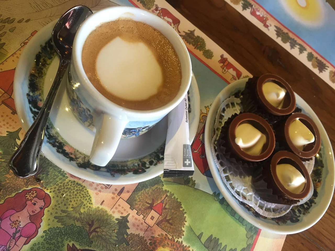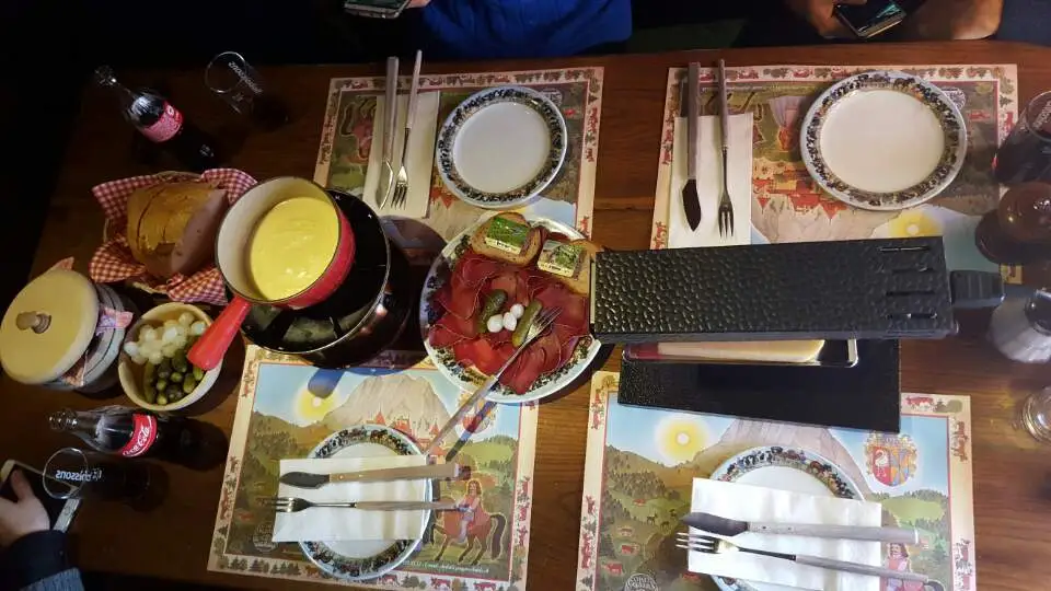나무 건물로 된 식당의 분위기는 따뜻했다. 창에는 마치 할머니가 만들어준 듯한 커튼이 걸려있었고 식당 곳곳이 화분으로 꾸며져 있었다. 안내받은 테이블에는 귀여운 젖소와 마을의 풍경이 그려진 테이블 매트와 아기자기한 접시와 포크 그리고 나이프가 놓여 있었다. 메뉴는 빵, 베이컨, 햄, 감자 등을 치즈에 찍어먹는 퐁듀와 치즈를 녹여 똑같이 빵 등에 곁들여 먹는 라클렛으로 주문했다. 퐁듀는 한국에서도 흔히 접할 수 있지만 라클렛은 먹어본 적이 없었기 때문에 큰 기대가 됐다. 주문한 음식이 나오고 잠시 포토타임을 가진 후 바로 맛을 보았다. 사실 특별한 음식은 아니었다. 그럼에도 불구하고 빵, 베이컨 등에 치즈를 곁들여서 먹는 것뿐인데도 치즈의 고소함으로 함께 곁들이는 음식들이 풍미가 배가 되었다. 별거 아닌 감자인데도 더욱 고소하게 즐길 수 있었다. 라클렛은 치즈를 녹이는 방식을 바라보는 것만으로도 눈요기가 될 뿐만 아니라 치즈를 직접 긁어먹는 즐거움도 있었다. 직원분들도 이방인들에게 무척 친절하여 기분이 더욱 좋았다. 식사를 마치니 마지막으로 커피와 초콜릿이 나왔고 완벽한 식사에 걸맞은 마무리였다.