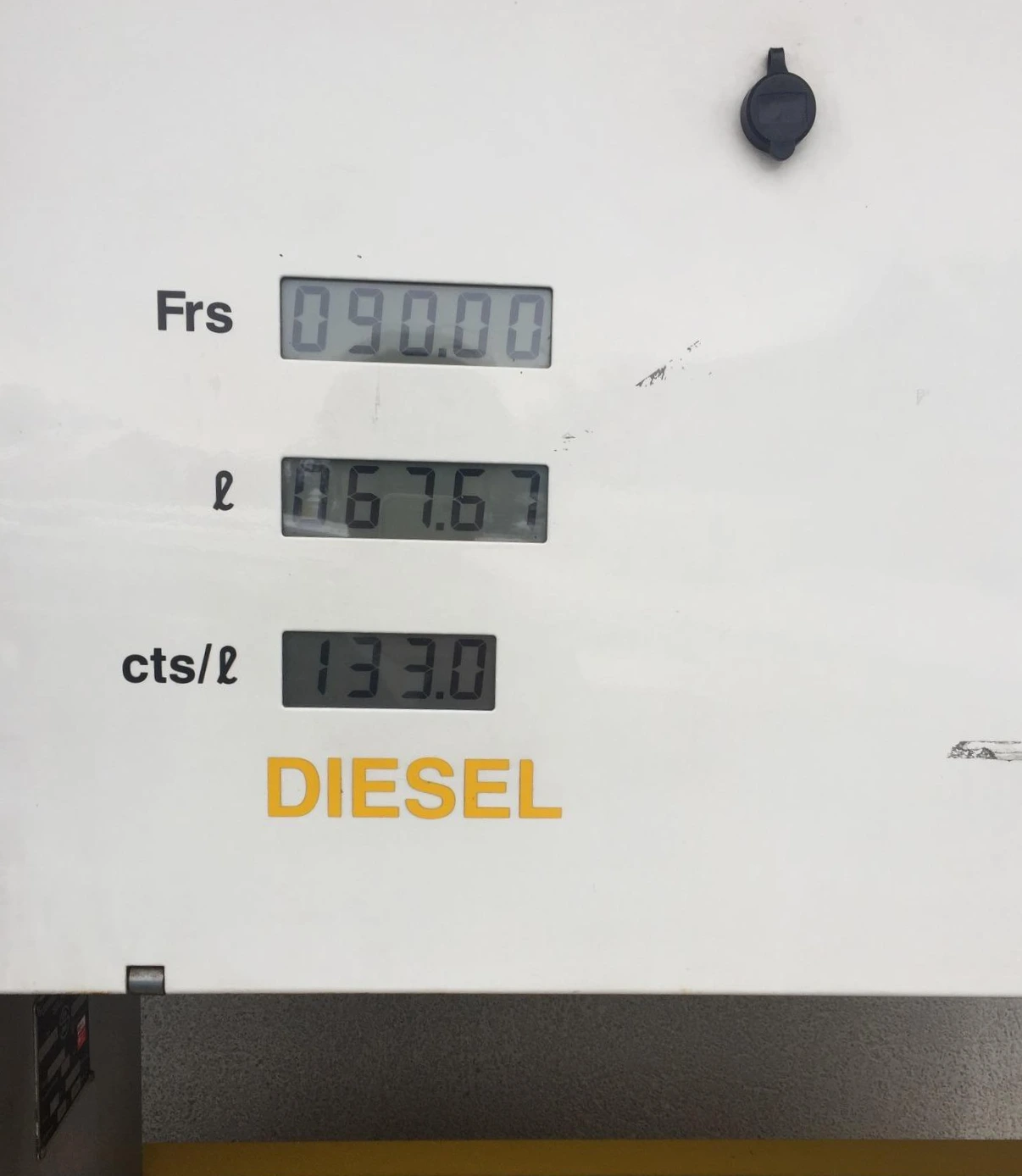 그 길을 벗어나고도 한 참 동안 시골길이 계속되었다. 우리를 제외하고 지나가는 차량은 전혀 없었고, 계속해서 첫 발자국을 남기며 그뤼에르로 향했다. 하지만, 얼마 지나지 않아 다시 한번 긴급한 상황에 직면하게 되었다. 기름이 없었다. 기름만 없었다면 다행이지만 아무리 생각해도 우리가 가고 있는 이 길에는 주유소가 없어 보였다. 그뤼에르까지는 한참이나 더 가야 했고, 이미 차량 계기판에는 주유가 필요하다는 안내등이 반짝이고 있었다. 우리가 할 수 있는 건 우리가 가는 이 길에 주유소가 있기를 간절히 비는 수밖에 없었다. 한참을 달려도 아무것도 보이지 않았다. 정말 큰일이 나는가라는 생각이 들려던 찰나 앞쪽에 슈퍼마켓으로 보이는 작은 건물이 하나 보였다. 무심결에 지나칠 뻔했지만 마켓 옆으로 주유기계로 보이는 작은 박스가 보였고 그 즉시 급하게 차를 돌렸다. 기름값이 적힌 안내판도 주유소라는 간판도 전혀 없었지만 기계에 적힌 'DIESEL'이라는 단어와 옆에 걸려있는 주유노즐을 보니 기름을 넣는 곳이 확실했다. 이곳이라면 기름이 아무리 비싸더라도 넣을 수밖에 없었다. 기계를 사용하는 데에도 조금 애를 먹었지만 다행히 주유를 하고 다시 편안한 마음으로 길을 나설 수 있었다. 여러모로 아찔한 순간이었다. 그뤼에르의 치즈는 우리를 쉽게 허락하지 않았다. 하지만 이후 덕분에 우리는 더 즐거운 마음으로 만찬을 즐길 수 있었다.